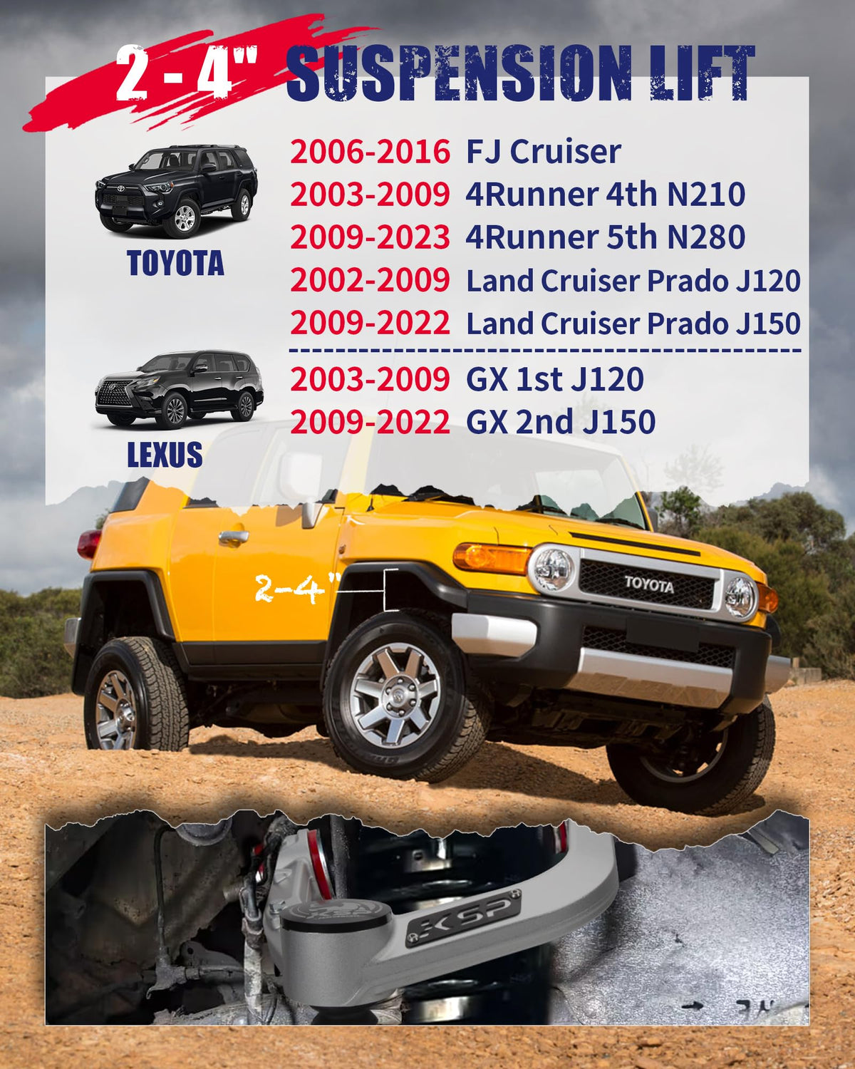 ***KSP PERFORMANCE Front Upper Control Arms W/H High Quality Guarantee***Features and Benefits:1.Designed for vehicles with 2 to 4 inches offroad lift2.Improves suspension travel 3.CNC Bended DOM Seamless Tubing With Heavy Duty Pre-Pressed Ball Joint 4.Professionally Precision Welded 5.Dual Stage Bushing Design for Improved Durability & Response 6.Corrects geometry for proper alignment and improved handling 7.Polyurethane Bushings, zert fittings for easy lubrication 8.ED process and painting for the highest durability 9.Direct replacement for factory arms on suspension that require 10.Additional strength and alignment geometry 11.Professional installation recommended 12.Hardware included Description -These control arms are direct replacement for factory arms on suspension that require additional strength and alignment geometry.-Designed specifically for toyota with 2 inch to 4 inches of front lift will restore proper geometry and alignment which will improve driving, handling characteristics and suspension articulation. Includes polyurethane bushings and zerk fittings for simple lubrication.