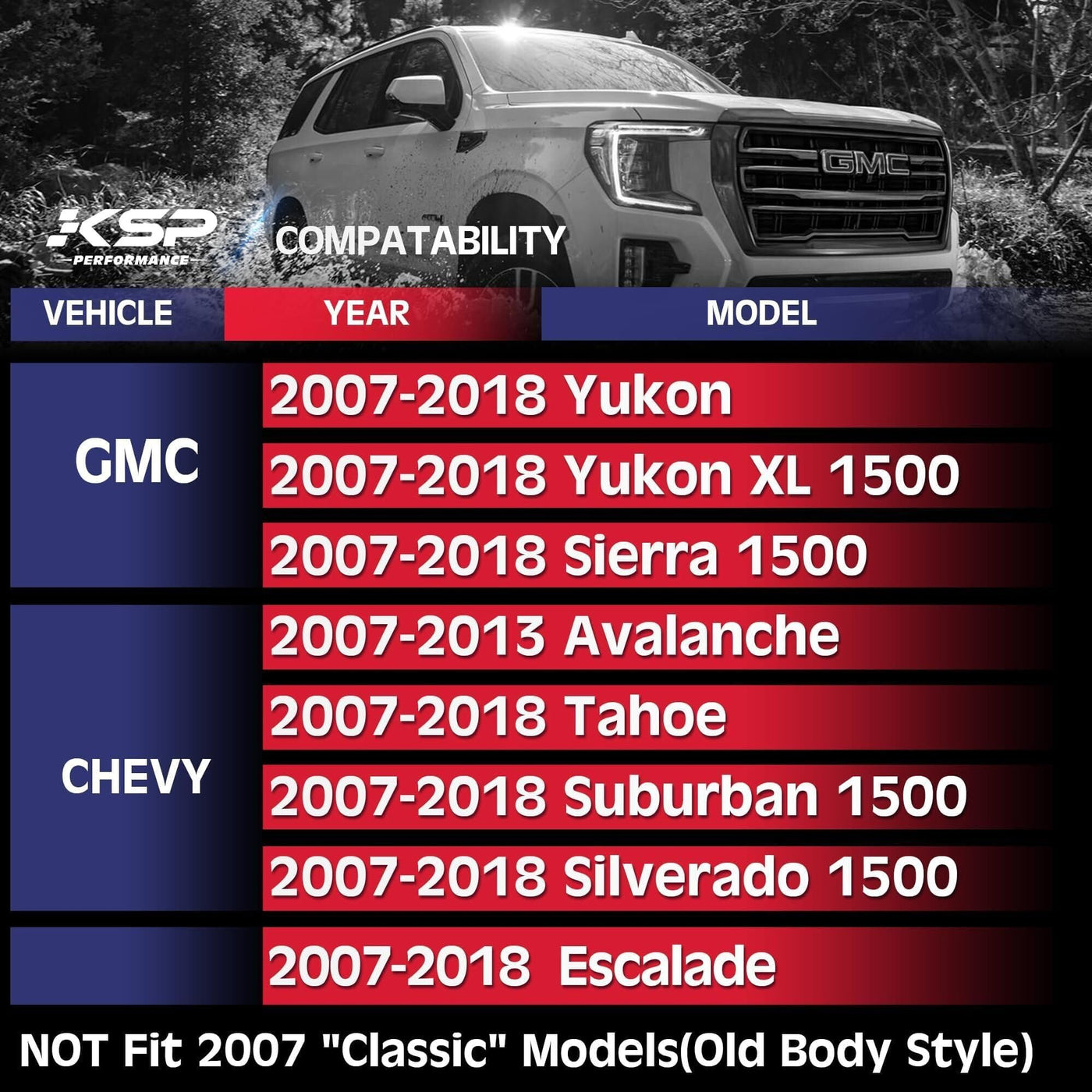 ***KSP PERFORMANCE Suspension arms W/H High Quality Guarantee*** 100% brand new Professional installation is highly recommended Installation Instruction is not included Include 1 pair kit and hardware as shown in pictures No returns or exchange once installed COMPATABILITY:(Please check your vehicle compatibility BEFORE buying): 2007-2018 Chevy Silverado 1500 2WD 4WD, 2007-2018 Chevy Tahoe 2WD 4WD , 2007-2018 Chevy Suburban 1500 2WD 4WD , 2007-2013 Chevy Avalanche 2WD 4WD, 2007-2018 GMC Sierra 1500 2WD 4WD, 2007-2018 GMC Yukon 2WD 4WD , 2007-2018 GMC Yukon XL 1500 2WD 4WD, 2007-2018 Cadillac Escalade 2WD 4WD, Does NOT fit 2007 ''Classic'' models. (old body style) Measuring Guide: Measure your stock front and rear heights from the ground to bottom of the trim. The style of level or lift will determine how much height you will need to add to the front or rear. To level your vehicle, add a lift amount equivalent to the difference between front and rear heights. To lift your vehicle - while retaining the stock look, add the same lift amount to both front and rear. To level lift your vehicle, add the amount of lift you'd like for the front to the difference between front and rear stock heights and use this for your rear lift.