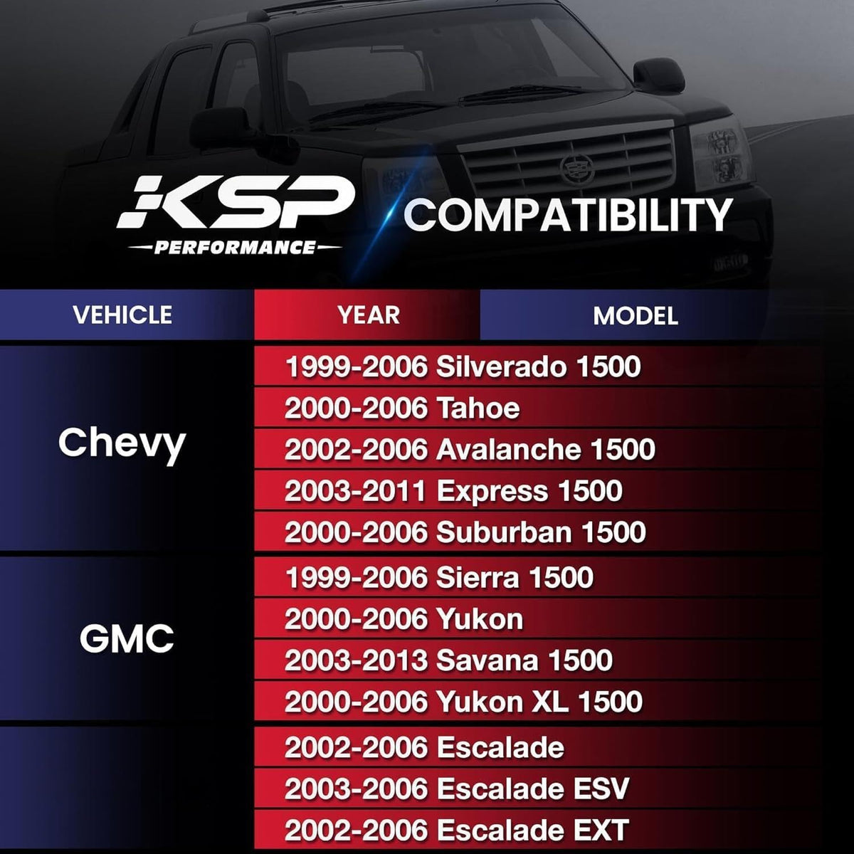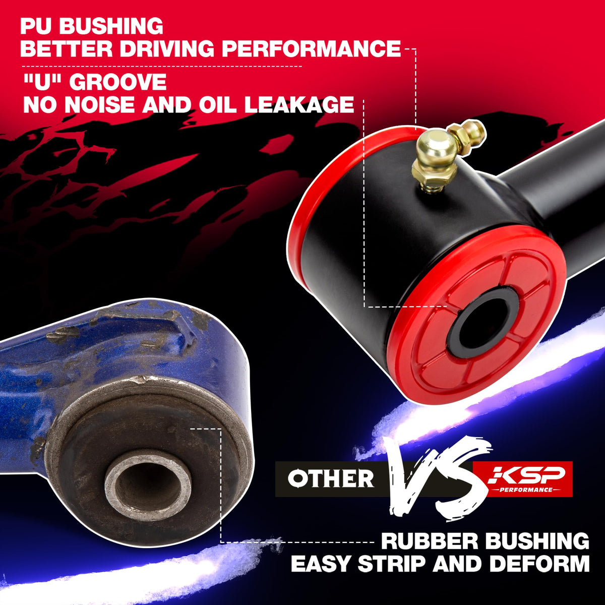 ***KSP PERFORMANCE Front Upper Control Arms W/H High Quality Guarantee***Features and Benefits:1.Designed for vehicles with 2 to 4 inches offroad lift2.Improves suspension travel 3.CNC Bended DOM Seamless Tubing With Heavy Duty Pre-Pressed Ball Joint 4.Professionally Precision Welded 5.Dual Stage Bushing Design for Improved Durability & Response 6.Corrects geometry for proper alignment and improved handling 7.Polyurethane Bushings, zert fittings for easy lubrication 8.ED process and painting for the highest durability 9.Direct replacement for factory arms on suspension that require 10.Additional strength and alignment geometry 11.Professional installation recommended 12.Hardware included Fitment: Fit for 1999 2000 2001 2002 2003 2004 2005 2006 Chevy Silverado 1500 & GMC Sierra 1500 4WD 4X4 RWD Description -These control arms are direct replacement for factory arms on suspension that require additional strength and alignment geometry.-Designed specifically for Chevy Silverado 1500 & GMC Sierra 1500 4WD 4X4 RWD with 2 inch to 4 inches of front lift will restore proper geometry and alignment which will improve driving, handling characteristics and suspension articulation. Includes polyurethane bushings and zerk fittings for simple lubrication.