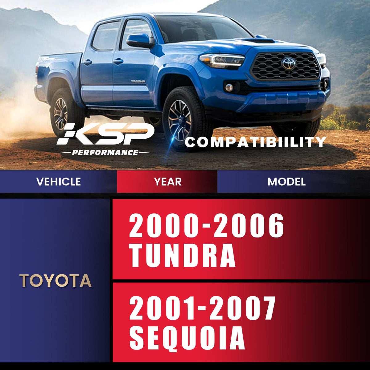 ***KSP PERFORMANCE Front Upper Control Arms W/H High Quality Guarantee***Features and Benefits:1.Designed for vehicles with 2 to 4 inches offroad lift2.Improves suspension travel 3.CNC Bended DOM Seamless Tubing With Heavy Duty Pre-Pressed Ball Joint 4.Professionally Precision Welded 5.Dual Stage Bushing Design for Improved Durability & Response 6.Corrects geometry for proper alignment and improved handling 7.Polyurethane Bushings, zert fittings for easy lubrication 8.ED process and painting for the highest durability 9.Direct replacement for factory arms on suspension that require 10.Additional strength and alignment geometry 11.Professional installation recommended 12.Hardware included Fitment: Fit for 2000 2001 2002 2003 2004 2005 2006 Toyota Tundra Fit for 2001 2002 2003 2004 2005 2006 2007 Toyota SequoiaDescription -These control arms are direct replacement for factory arms on suspension that require additional strength and alignment geometry.-Designed specifically for Toyota Tundra and Sequoia with 2 inch to 4 inches of front lift will restore proper geometry and alignment which will improve driving, handling characteristics and suspension articulation. Includes polyurethane bushings and zerk fittings for simple lubrication.
