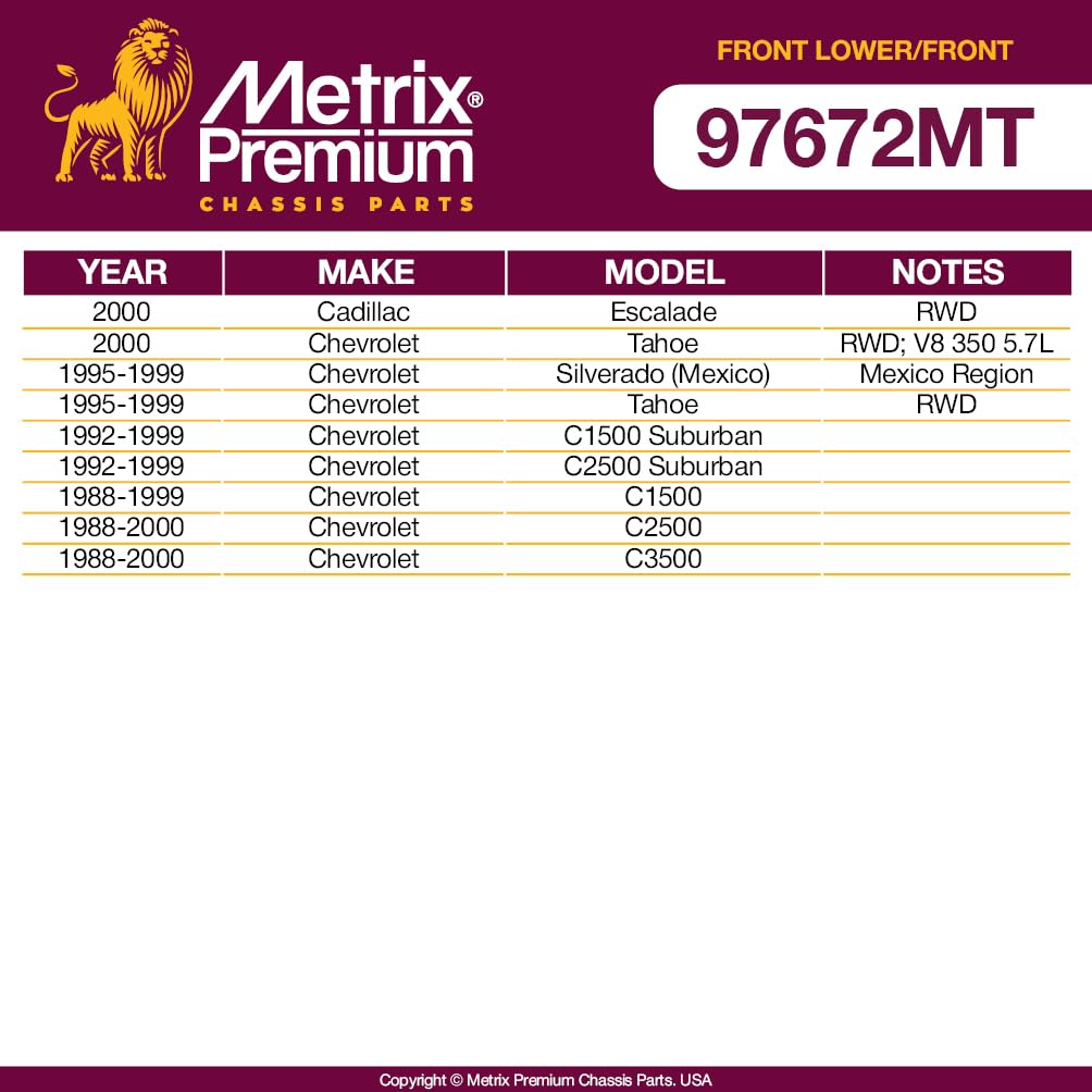 Metrix Premium Chassis Parts Control Arms are precision-engineered to meet or exceed OEM specifications. Our control arms provide seamless fitment, enhanced handling, and long-lasting support for European, Asian, and American passenger cars and lightweight commercial vehicles.At Metrix Premium Chassis Parts, we specialize in a comprehensive range of high-quality automotive parts, including control arms, ball joints, control arm bushings, sway bar bushings, stabilizer bar links, inner and outer tie rod ends, pitman arms, idler arms, drag links, center links, track bars, adjusting sleeves, brake rotors, and brake pads.Trusted by professionals and DIYers, our products are precision-designed for optimal performance, safety, and ease of installation. Our control arm lineup includes front and rear upper control arms, lower control arms, and control arm kits, with most models featuring pre-installed ball joints and control arm bushings. These components are pre-greased to reduce wear and extend lifespan, delivering smooth and stable handling.For complete front end rebuild projects, our catalog also offers inner tie rods, outer tie rod ends, and sway bar links, allowing you to restore or upgrade your vehicle's suspension and steering system with confidence.Key Features:-Precision Engineering: Most control arms with ball joints are designed for exact fitment, proper alignment, and enhanced steering control.-Durable Construction: Manufactured with high-strength, corrosion-resistant materials to withstand heavy loads and challenging driving conditions.-Comprehensive Compatibility: Products are crafted to seamlessly integrate with various vehicle systems, ensuring stability and support.-Ease of Installation: Designed to simplify installation and reduce downtime.Every product from Metrix Premium Chassis Parts undergoes rigorous testing to ensure superior quality, reliability, and performance.