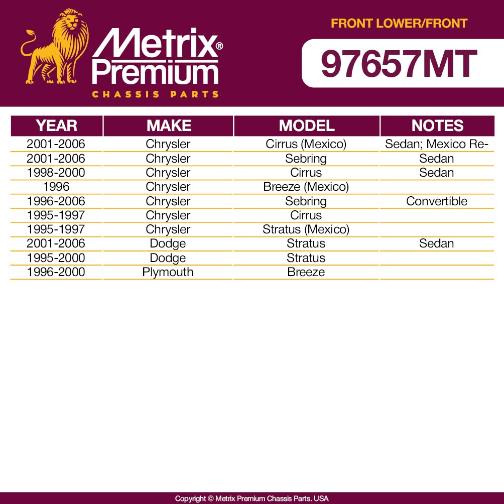 Metrix Premium Chassis Parts Control Arms are precision-engineered to meet or exceed OEM specifications. Our control arms provide seamless fitment, enhanced handling, and long-lasting support for European, Asian, and American passenger cars and lightweight commercial vehicles.At Metrix Premium Chassis Parts, we specialize in a comprehensive range of high-quality automotive parts, including control arms, ball joints, control arm bushings, sway bar bushings, stabilizer bar links, inner and outer tie rod ends, pitman arms, idler arms, drag links, center links, track bars, adjusting sleeves, brake rotors, and brake pads.Trusted by professionals and DIYers, our products are precision-designed for optimal performance, safety, and ease of installation. Our control arm lineup includes front and rear upper control arms, lower control arms, and control arm kits, with most models featuring pre-installed ball joints and control arm bushings. These components are pre-greased to reduce wear and extend lifespan, delivering smooth and stable handling.For complete front end rebuild projects, our catalog also offers inner tie rods, outer tie rod ends, and sway bar links, allowing you to restore or upgrade your vehicle's suspension and steering system with confidence.Key Features:-Precision Engineering: Most control arms with ball joints are designed for exact fitment, proper alignment, and enhanced steering control.-Durable Construction: Manufactured with high-strength, corrosion-resistant materials to withstand heavy loads and challenging driving conditions.-Comprehensive Compatibility: Products are crafted to seamlessly integrate with various vehicle systems, ensuring stability and support.-Ease of Installation: Designed to simplify installation and reduce downtime.Every product from Metrix Premium Chassis Parts undergoes rigorous testing to ensure superior quality, reliability, and performance.