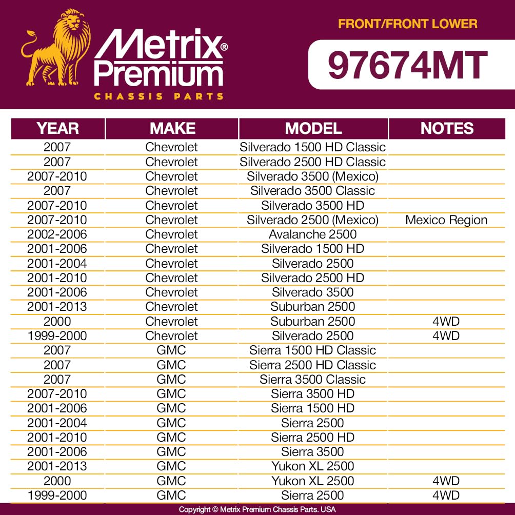 Metrix Premium Chassis Parts Control Arms are precision-engineered to meet or exceed OEM specifications. Our control arms provide seamless fitment, enhanced handling, and long-lasting support for European, Asian, and American passenger cars and lightweight commercial vehicles.At Metrix Premium Chassis Parts, we specialize in a comprehensive range of high-quality automotive parts, including control arms, ball joints, control arm bushings, sway bar bushings, stabilizer bar links, inner and outer tie rod ends, pitman arms, idler arms, drag links, center links, track bars, adjusting sleeves, brake rotors, and brake pads.Trusted by professionals and DIYers, our products are precision-designed for optimal performance, safety, and ease of installation. Our control arm lineup includes front and rear upper control arms, lower control arms, and control arm kits, with most models featuring pre-installed ball joints and control arm bushings. These components are pre-greased to reduce wear and extend lifespan, delivering smooth and stable handling.For complete front end rebuild projects, our catalog also offers inner tie rods, outer tie rod ends, and sway bar links, allowing you to restore or upgrade your vehicle's suspension and steering system with confidence.Key Features:-Precision Engineering: Most control arms with ball joints are designed for exact fitment, proper alignment, and enhanced steering control.-Durable Construction: Manufactured with high-strength, corrosion-resistant materials to withstand heavy loads and challenging driving conditions.-Comprehensive Compatibility: Products are crafted to seamlessly integrate with various vehicle systems, ensuring stability and support.-Ease of Installation: Designed to simplify installation and reduce downtime.Every product from Metrix Premium Chassis Parts undergoes rigorous testing to ensure superior quality, reliability, and performance.