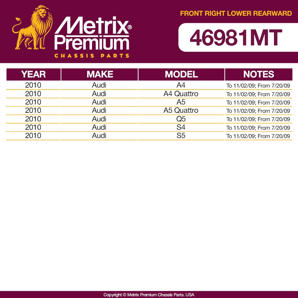 Metrix Premium Chassis Parts - Front Right Lower Rearward Control Arm W Ball Joint & Bushing Assembly Fits 2010 Audi A4, A4 Quat