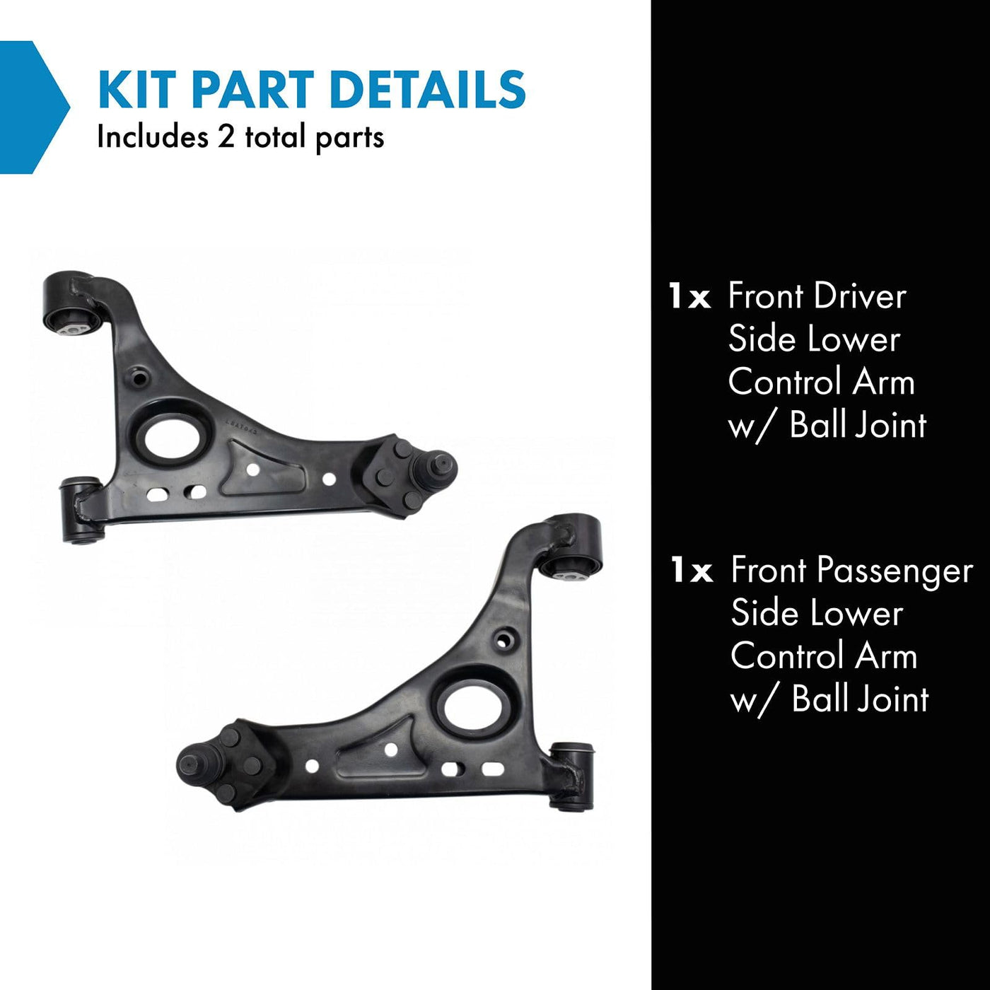 2 Piece Control Arm with Ball Joint SetKit Includes(1) Front Driver Side Lower Control Arm with Ball Joint(1) Front Passenger Side Lower Control Arm with Ball JointFitmentCompatible with: 2015-22 Chevrolet Trax Front Driver & Passenger Side LowerCompatible with: 2013-22 Buick Encore Front Driver & Passenger Side LowerProduct AttributesQuantity: 2 PieceReference NumbersDelphi: TC3248Dorman - OE Solutions: 526-778, 527-959General Motors: 94540671, 94540672, 95328050, 95328051, 95328052, 95328053Hollander: 512-01609R, 512-01610L, 512-10190R, 512-10191LMevotech Supreme: CMS501189, CMS501190Mevotech: CMS501189, CMS501190MOOG Chassis Products: RK623137, RK623138