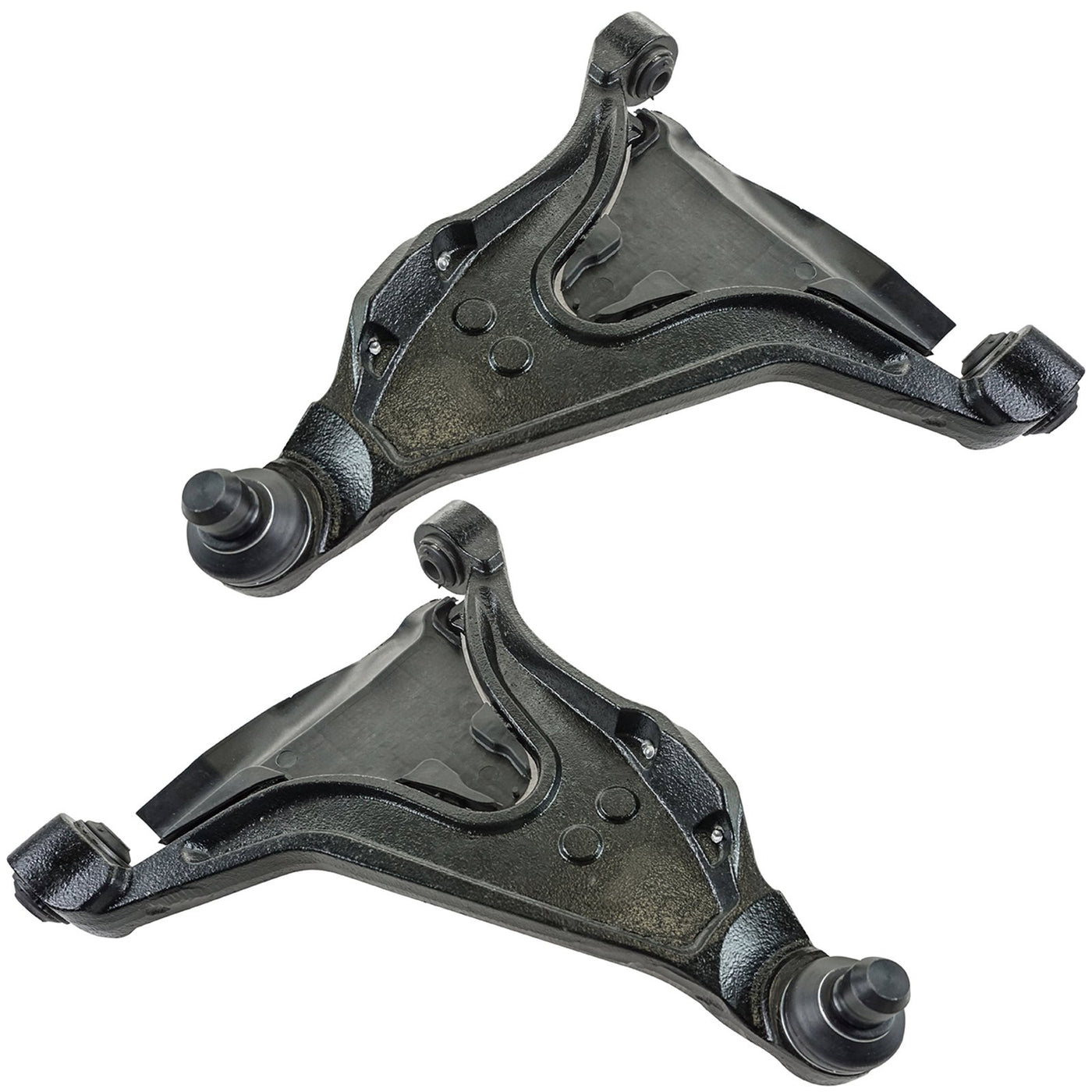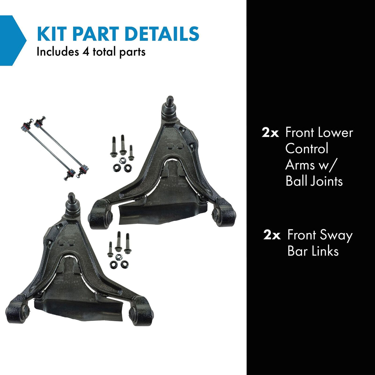 Q: What components are included in the suspension kit?A: The suspension kit includes four pieces: two front lower control arms with ball joints and two front sway bar links, providing a complete solution for your vehicle's suspension needs.