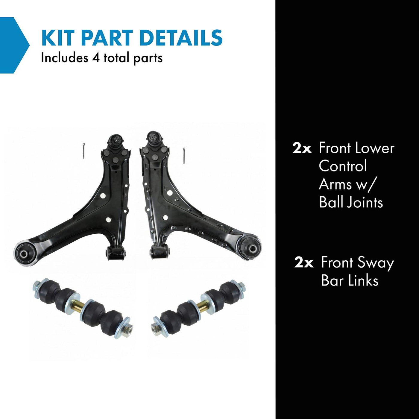 4 Piece Suspension Kitkit Includes(2) Front Lower Control Arms With Ball Joints(2) Front Sway Bar Linksfitmentcompatible With: 1995-05 Chevrolet Cavalier Frontcompatible With: 1995-05 Pontiac Sunfire Frontproduct Attributesquantity: 4 Pieceproduct Features Application Specific Design: No Modifications Necessary Anti-Corrosion Coated: Enhanced Surface Life Pre-Greased: No Additional Maintenance Required Kitted For Restored Performance: Improved Road-Feel And Handlingitem Detailstrq Suspension Kits Are Manufactured Using Premium Raw Materials And Coatings For Extended Service Life. Each Trq Suspension Component Is Designed To Be A Direct, Maintenance-Free Replacement To The Stock Unit. To Extend The Life Of Your Steering And Suspension Components, Trq Recommends Replacing Components In Pairs, Sets, Or Kits. All Products Are Fit And Road-Tested In Our Massachusetts R&D Facility To Ensure We Deliver On Our Promise Of Trusted Reliable Quality.Reference Numbersacdelco: 45D3155, 45D3156, 46G0027Abeck/Arnley: 101-5993Carquest: Ca166B, Ca167Bcentric Parts: 623.62031, 623.62032Diy Solutions: Sus05368, Sus05445Dorman - Oe Solutions: 520-101, 520-102Dorman - Premium: Cb90173Pr, Cb90174Prdorman: 520-101, 520-102Falcon Automotive: Ca350, Ca351Falcon Steering Systems: Fca350, Fca351, K6600General Motors: 15217436, 15217437, 22603946, 22603947, 22603949, 22611124, 22611125, 22637807, 22645739, 22645740, 22645743, 22645744, 22645801, 22645802, 22650965Hollander: 512-01136Al, 512-1136Aringalls Engineering: Cak620271, Cak620272Mas Industries: Cb90173, Cb90173Pr, Cb90174, Cb90174Pr, Sk6600Mcquay-Norris: Fa4184, Fa4185, Sl232Hdmevotech: Cms20271, Cms20272, Gs20271, Gs20272, Mk6600, Ms20271, Ms20272, Rms20271, Rms20272Moog Chassis Products: Ck620271, Ck620272, K620271, K620272, K6600, Rk620271, Rk620272Napa Premium: 2605311, 2605312Napa: 18230Hb, 2605311, 2605312Precision Driveline: 5Cb50028, Cb50027, Cb50028Quicksteer: K6600Raybestos Brakes: 545-1027Braybestos Chassis: 507-1155, 507-1156Syd: 22645740R, 22645741Ltrw Steering And Suspension Parts: Jts655