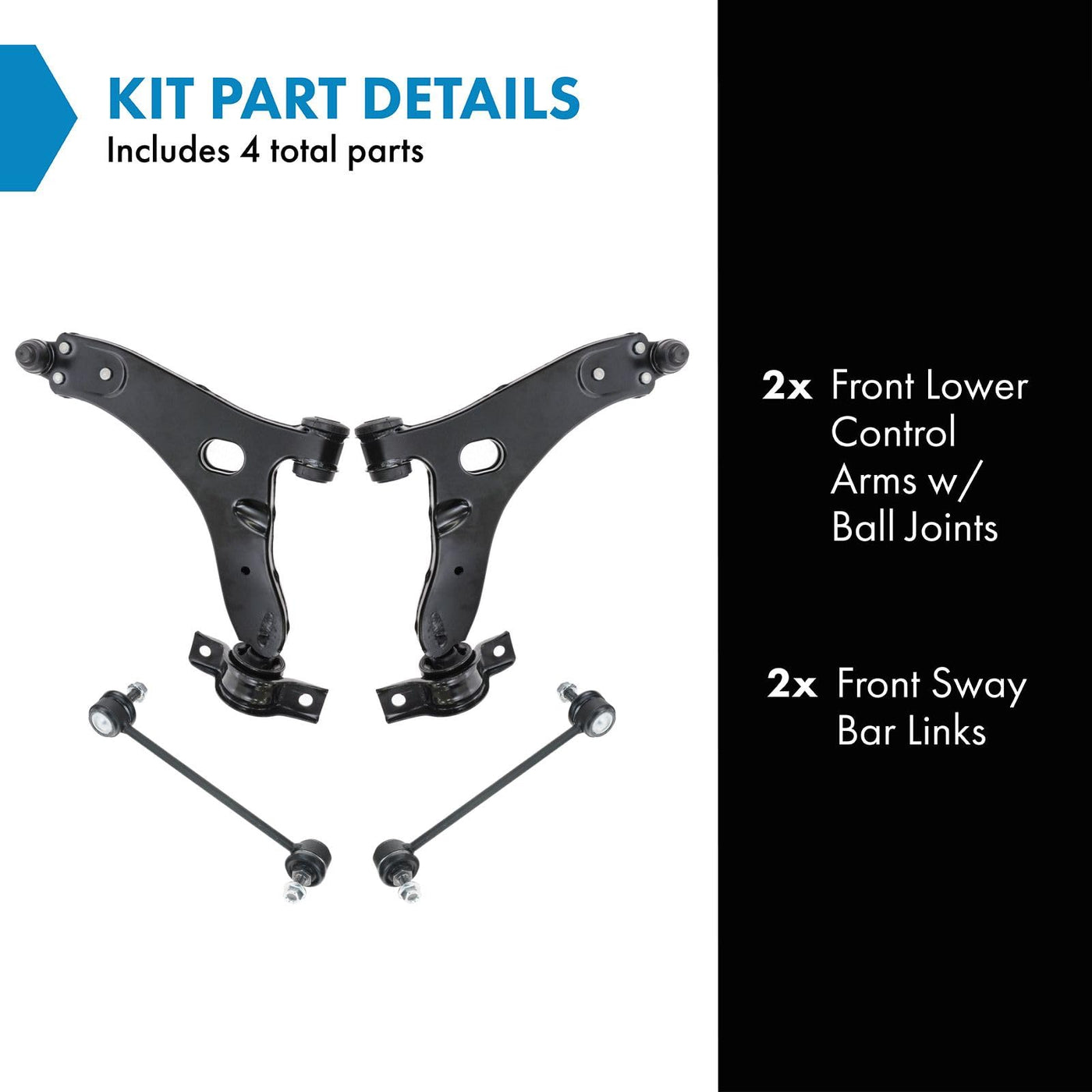 4 Piece Suspension Kitkit Includes(2) Front Lower Control Arms With Ball Joints(2) Front Sway Bar Linksfitmentcompatible With: 2005-09 Ford Focus Frontcompatible With: 2010 Ford Focus To 12/22/09 Production Date Frontcompatible With: 2004 Ford Focus From 4/05/04 Production Date Frontproduct Attributesquantity: 4 Pieceproduct Features Application Specific Design: No Modifications Necessary Anti-Corrosion Coated: Enhanced Surface Life Pre-Greased: No Additional Maintenance Required Kitted For Restored Performance: Improved Road-Feel And Handlingitem Detailstrq Suspension Kits Are Manufactured Using Premium Raw Materials And Coatings For Extended Service Life. Each Trq Suspension Component Is Designed To Be A Direct, Maintenance-Free Replacement To The Stock Unit. To Extend The Life Of Your Steering And Suspension Components, Trq Recommends Replacing Components In Pairs, Sets, Or Kits. All Products Are Fit And Road-Tested In Our Massachusetts R&D Facility To Ensure We Deliver On Our Promise Of Trusted Reliable Quality.Reference Numbersacdelco: 45D3290, 45D3291Carquest: Ca456B, Ca457Bcentric Parts: 622.61004, 622.61005, 623.61004, 623.61005Delphi: Tc2108, Tc2109Diy Solutions: Sus05605, Sus05606, Sus06646Dorman - Oe Solutions: 520-489, 520-490Dorman - Premium: Cb85263Pr, Cb85264Prdorman: 520-489, 520-490Falcon Steering Systems: Fk80407, Fk80408Ford: 5S4Z5K484Aa, 6S4Z3078Aa, 6S4Z3079Aa, 7S433042Aa, 7S433051Aa, 7S4Z3078A, 7S4Z3079A, 8S4Z3078A, 8S4Z3079A, 9S4Z3078A, 9S4Z3079A, Ys4Z5K484Aahollander: 512-01451R, 512-01452Lingalls Engineering: Cak80407, Cak80408Mas Industries: Cb85263, Cb85263Pr, Cb85264, Cb85264Pr, Cb85403, Cb85404Mcquay-Norris: Fa4393, Fa4394Mevotech: Cmk80407, Cmk80408, Gk80407, Gk80408, Mk80066, Mk80407, Mk80408Moog Chassis Products: Ck80407, Ck80408, K80066, K80407, K80408, Rk80407, Rk80408Motorcraft: 6S433042Aa, 6S433051Aa, Mcsoe119, Mcsoe130, Mcsoe144, Mcsoe48, Mcsoe49, Mcsoe98Napa Premium: 2605497, 2605498Napa: 260-5497, 260-5498Precision Driveline: Cb40060, Cb40061Raybestos Chassis: 507-1290, 507-1291