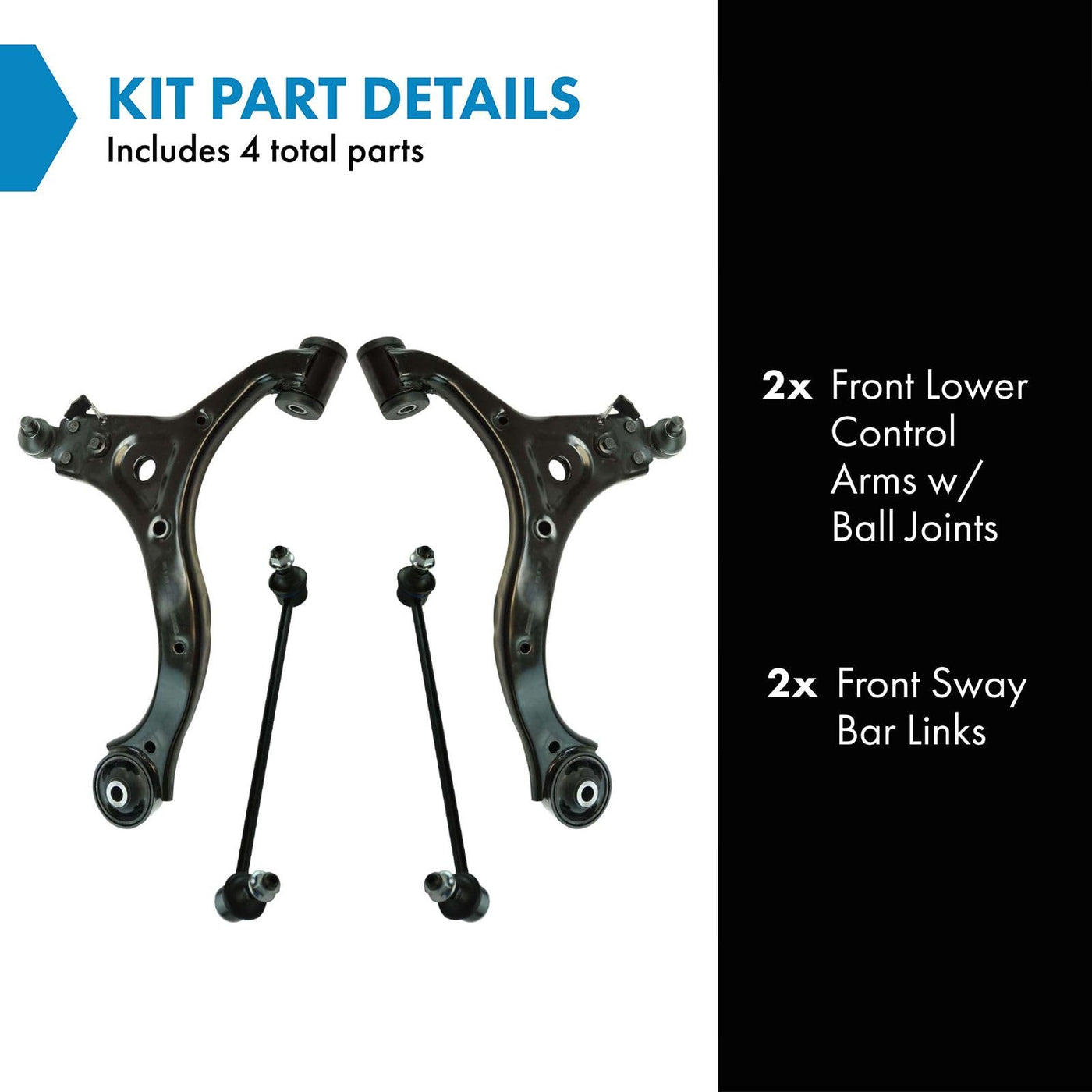 Q: What does the TRQ Front Suspension Kit include?A: The kit includes two Front Lower Control Arms with Ball Joints and two Front Sway Bar Links, totaling four pieces.
