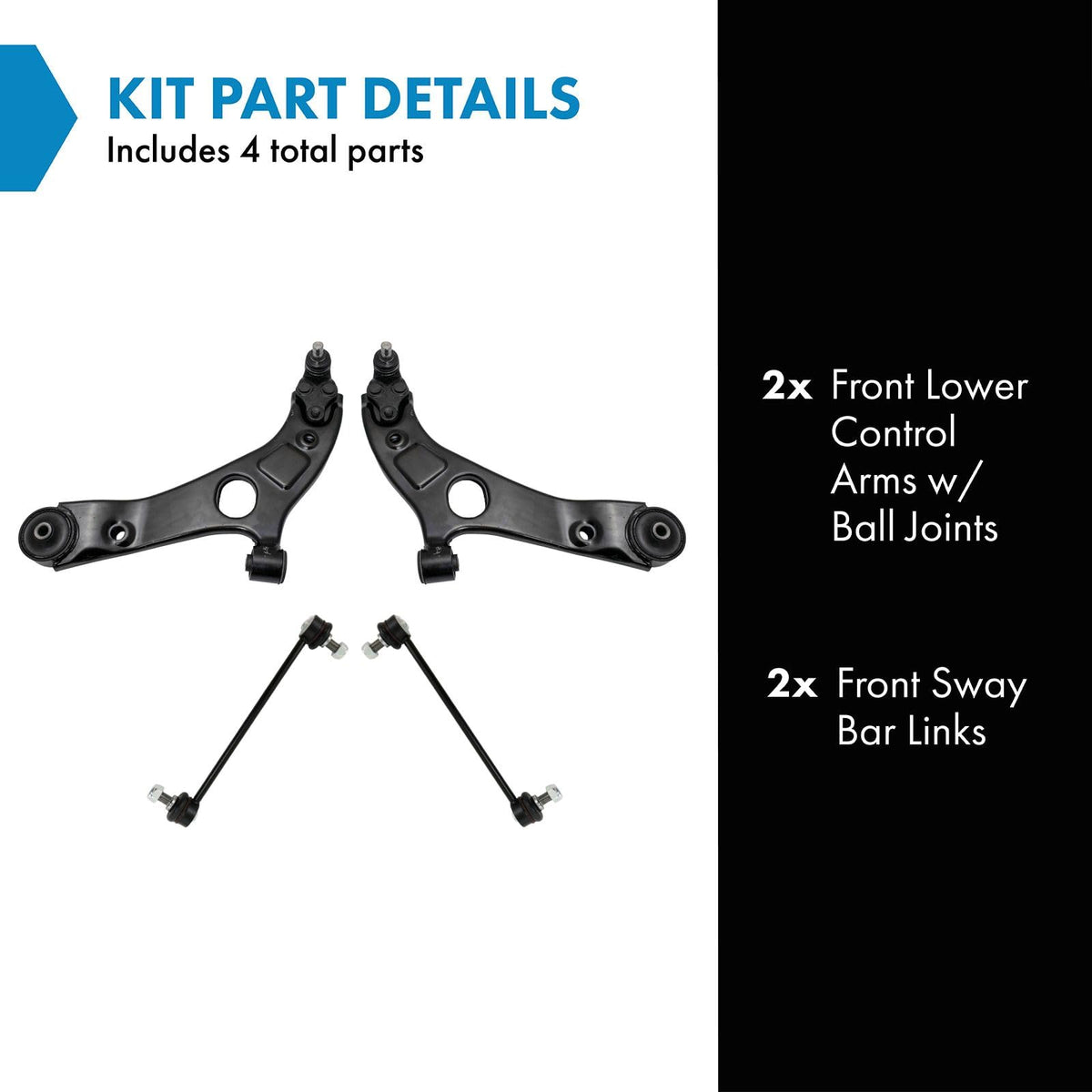 4 Piece Suspension Kitkit Includes(2) Front Lower Control Arms With Ball Joints(2) Front Sway Bar Linksfitmentcompatible With: 2012-15 Kia Optima Lx Frontcompatible With: 2012-15 Kia Optima Sx Frontcompatible With: 2012-15 Kia Optima Ex Frontcompatible With: 2013-14 Hyundai Sonata Limited L4 2.4L With Sport Suspension Frontcompatible With: 2013-14 Hyundai Sonata L4 2.0L Frontcompatible With: 2013-15 Kia Optima Sxl Frontcompatible With: 2012 Hyundai Sonata Limited L4 2.4L From 12/01/11 Production Date With Sport Suspension Frontcompatible With: 2012 Hyundai Sonata L4 2.0L From 12/01/11 Production Date Frontcompatible With: 2014-16 Kia Cadenza Frontcompatible With: 2012-14 Hyundai Azera Frontproduct Attributesquantity: 4 Pieceproduct Features Application Specific Design: No Modifications Necessary Anti-Corrosion Coated: Enhanced Surface Life Pre-Greased: No Additional Maintenance Required Kitted For Restored Performance: Improved Road-Feel And Handlingitem Detailstrq Suspension Kits Are Manufactured Using Premium Raw Materials And Coatings For Extended Service Life. Each Trq Suspension Component Is Designed To Be A Direct, Maintenance-Free Replacement To The Stock Unit. To Extend The Life Of Your Steering And Suspension Components, Trq Recommends Replacing Components In Pairs, Sets, Or Kits. All Products Are Fit And Road-Tested In Our Massachusetts R&D Facility To Ensure We Deliver On Our Promise Of Trusted Reliable Quality.Reference Numbersacdelco: 45G1991Beck/Arnley: 101-7171, 101-7351, 101-7352, 102-7351, 102-7352Diy Solutions: Sus06119, Sus06120, Sus07142Dorman - Oe Solutions: 522-815, 522-816, 522-967, 522-968Dorman - Premium: Cb60343Pr, Cb60344Prdorman: 522-967, 522-968, Sl60335, Sl60335Xlhollander: 512-50648L, 512-50649Rhyundai: 545002T020, 545003S100, 545003S200, 545013S100, 545013S200, 548303Q000Import Direct Chassis: Ls13067, Ls14081Kia: 545002T030, 545003S100, 545012T020, 545012T030, 545013S100, 545013S200, 548303Q000Mas Industries: Cb60343, Cb60343G, Cb60343Pr, Cb60344, Cb60344G, Cb60344Pr, Sl60335Mcquay-Norris: Fa3998, Fa3999Mevotech: Cms901066, Cms901152, Cms901153, Ms901152, Ms901153, Ms90897Moog Chassis Products: K750658, Rk621592, Rk621593, Rk622362, Rk622363Napa Chassis Parts: 2653275Napa Premium: 2608014, 2608015, 2608190, 2608191Napa Proformer: 1653275Napa: 2606935, 2606936Precision Driveline: 5Cb90338, 5Cb90341Raybestos Brakes: 5451991