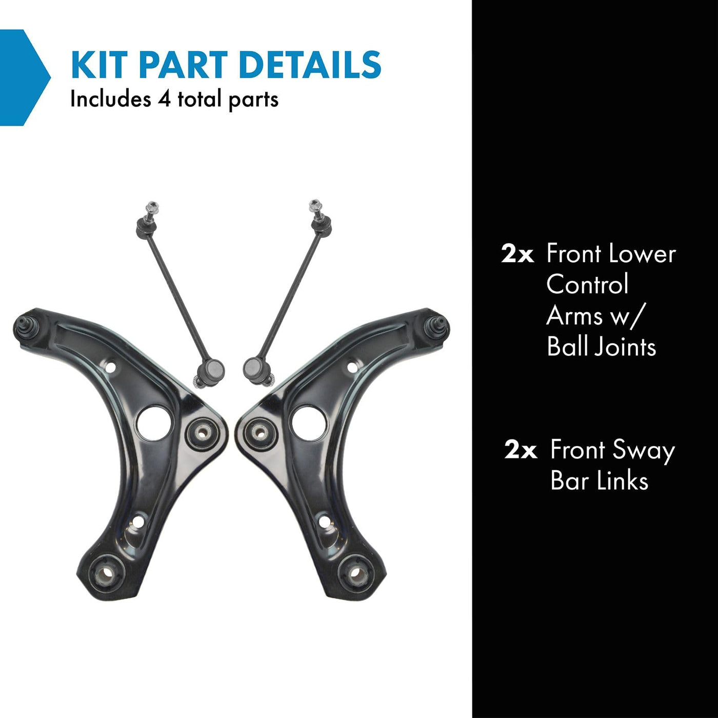 4 Piece Suspension Kitkit Includes(2) Front Lower Control Arms With Ball Joints(2) Front Sway Bar Linksfitmentcompatible With: 2013-19 Nissan Versa Frontcompatible With: 2014-19 Nissan Versa Note Frontcompatible With: 2012 Nissan Versa Sedan Frontcompatible With: 2015-17 Nissan Micra Frontproduct Attributesquantity: 4 Pieceproduct Features Application Specific Design: No Modifications Necessary Anti-Corrosion Coated: Enhanced Surface Life Pre-Greased: No Additional Maintenance Required Kitted For Restored Performance: Improved Road-Feel And Handlingitem Detailstrq Suspension Kits Are Manufactured Using Premium Raw Materials And Coatings For Extended Service Life. Each Trq Suspension Component Is Designed To Be A Direct, Maintenance-Free Replacement To The Stock Unit. To Extend The Life Of Your Steering And Suspension Components, Trq Recommends Replacing Components In Pairs, Sets, Or Kits. All Products Are Fit And Road-Tested In Our Massachusetts R&D Facility To Ensure We Deliver On Our Promise Of Trusted Reliable Quality.Reference Numbersbeck/Arnley: 101-7014Datsun/Nissan: 545001Hk0A, 545001Hk0B, 545001Hk0C, 545003Dn0A, 545011Hk0A, 545011Hk0B, 545011Hk0C, 545013Dn0A, 546181Fe0A, 546189U00A, 54618Jx00Adiy Solutions: Sus06013, Sus06014, Sus06970Dorman - Oe Solutions: 524-101, 524-102Dorman - Premium: Cb69313Prdorman: 524-101, 524-102Hollander: 512-58957R, 512-58958Lmas Industries: Cb69313, Cb69313Pr, Cb69314Mcquay-Norris: Fa3952, Fa3953Mevotech: Cms301137, Cms301138, Ms30844Moog Chassis Products: K750098, Rk621576, Rk621577Napa Premium: 2607322, 2607323Napa: 2606889, 2606890Nissan: 545011Hk0Bprecision Driveline: 4Cb30390Suzuki: 4521154L21
