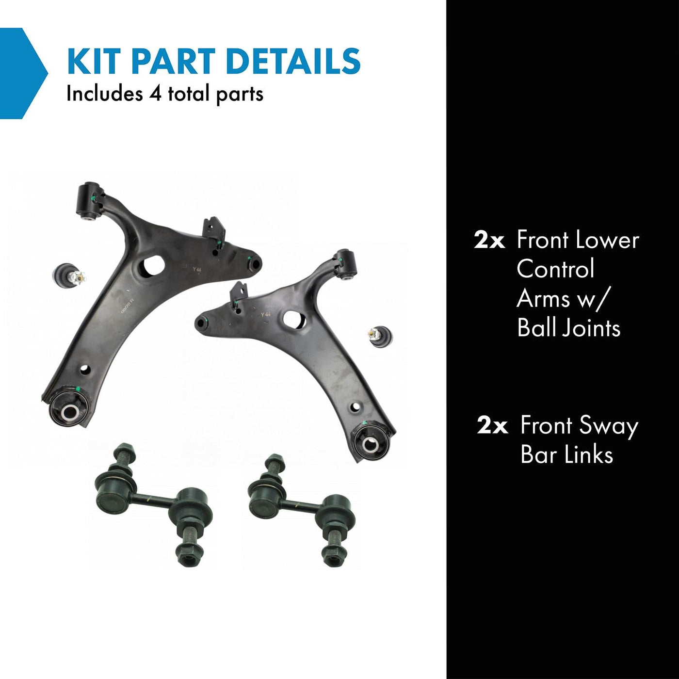 Q: What components are included in the suspension kit?A: The kit includes (2) Front Lower Control Arms with Ball Joints and (2) Front Sway Bar Links, providing a complete solution for suspension replacement.