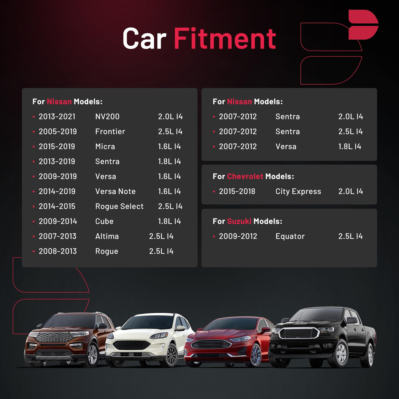 Q: What vehicles are compatible with BDFHYK LKAR6AIX-11 spark plugs?A: BDFHYK LKAR6AIX-11 spark plugs are compatible with various Nissan models including the 2007-2013 Altima, 2009-2014 Cube, 2005-2019 Frontier, and 2013-2021 NV200, among others. They also fit 2008-2013 Rogue, 2007-2019 Sentra, and several Chevy models like the 2015-2018 City Express. Always verify compatibility with your vehicle's year, make, model, and OE number.