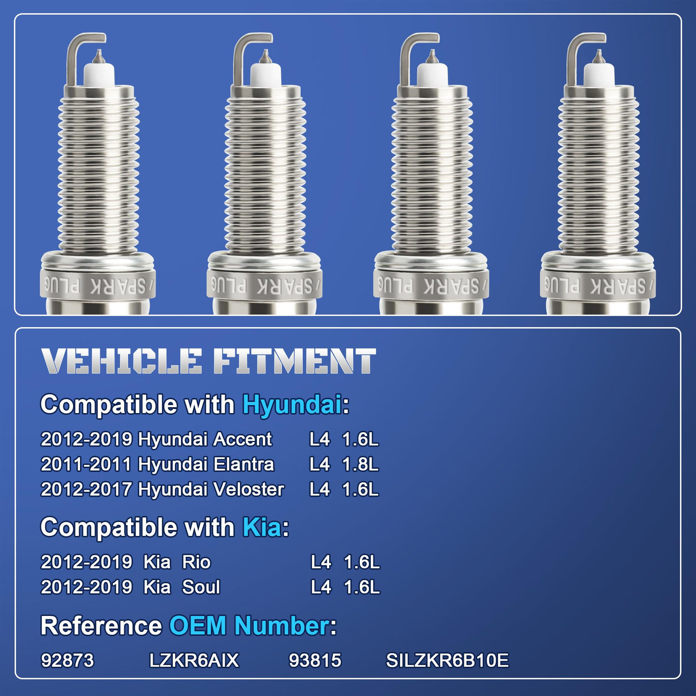 Iridium Spark Plugs 4 Pack Compatible with Hyundai Veloster Accent & Kia Soul Rio 2012 2013 2014 2015 2016 2017 2018 2019 L4 1.6