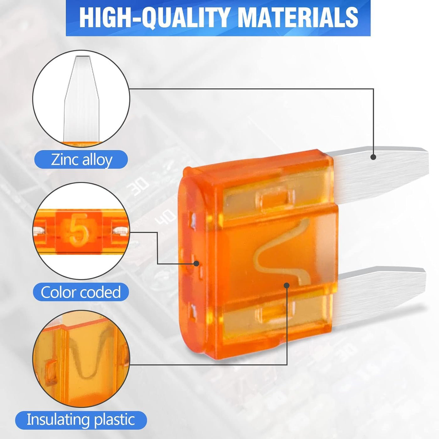 Q: What material are the 5 Amp mini fuses made of?A: The 5 Amp mini fuses are made of premium zinc alloy, which enhances their durability and efficiency in protecting your vehicle's electrical system.