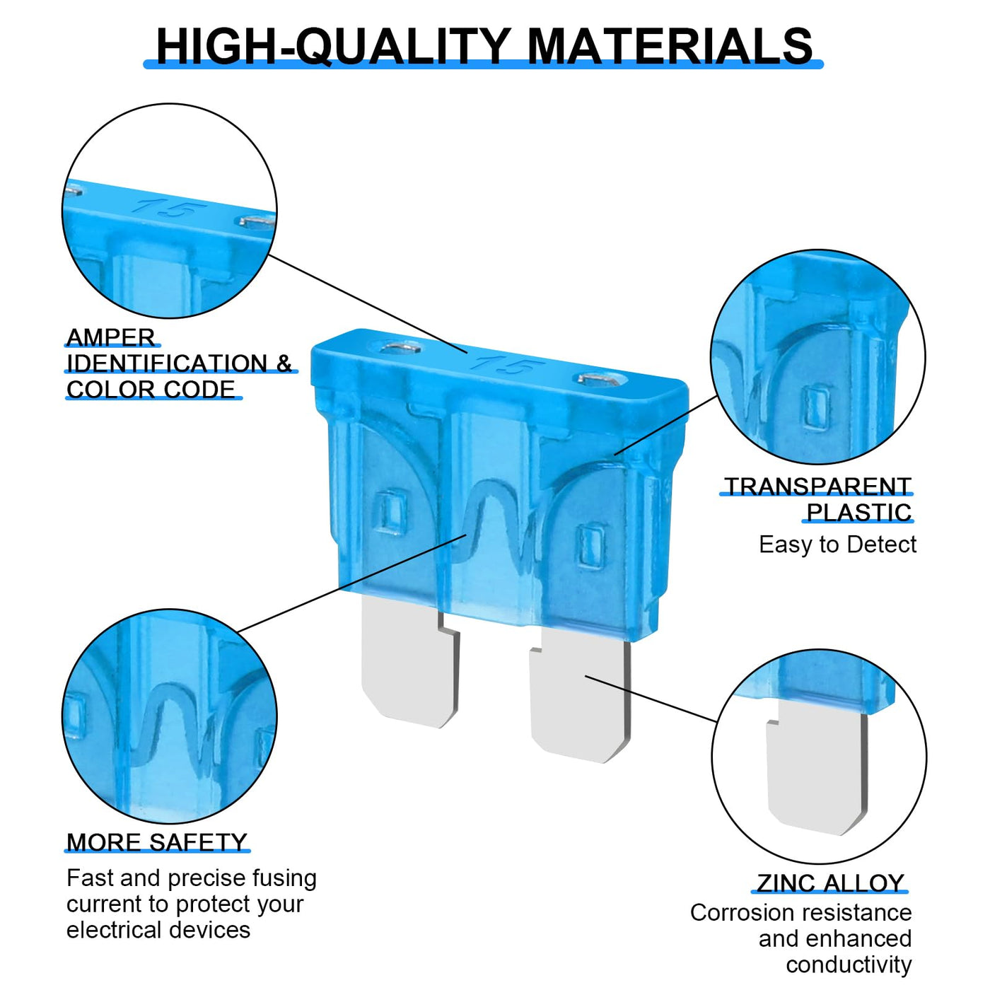 Q: What materials are used in the construction of these fuses?A: The automotive fuses in this kit are made from high-quality eco-friendly plastic and premium zinc alloy terminals, ensuring durability, corrosion resistance, and enhanced conductivity.