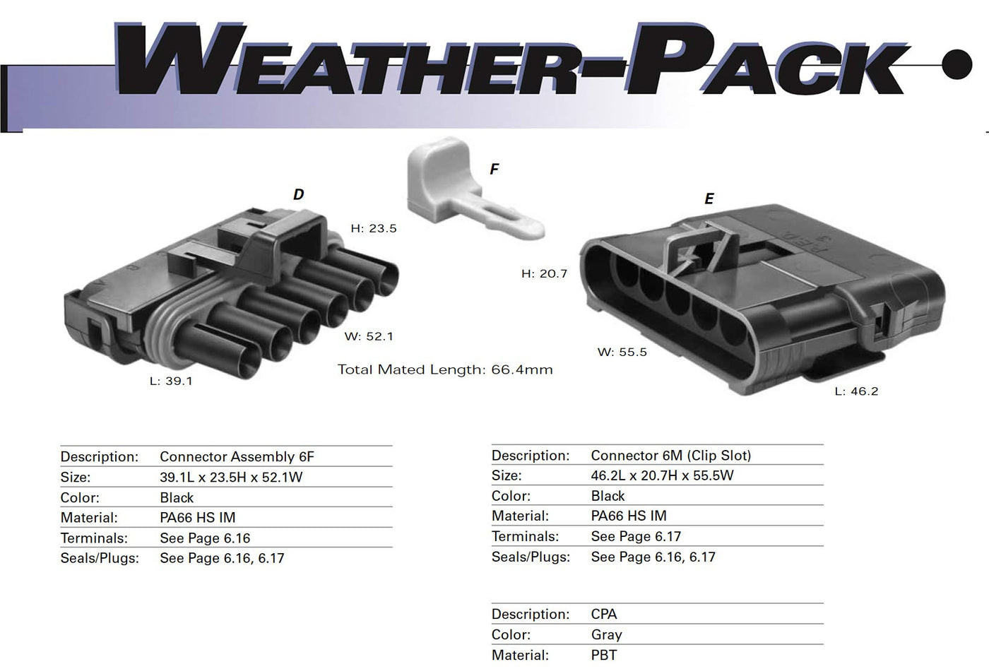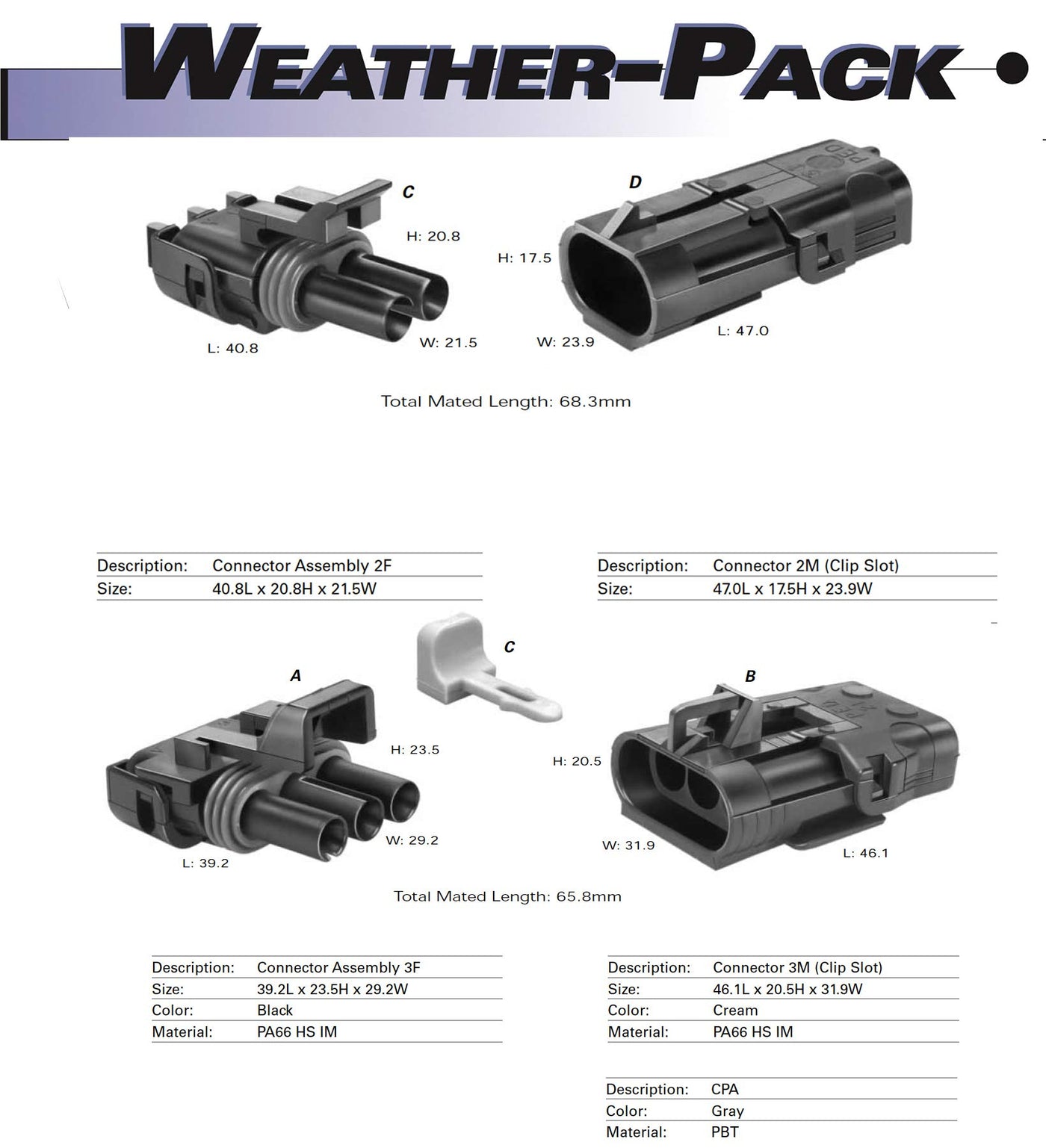 Q: Are the Weatherpack connectors environmentally sealed?A: Yes, the Weatherpack connectors are environmentally sealed to protect against moisture and dirt, ensuring reliable connections in harsh conditions.
