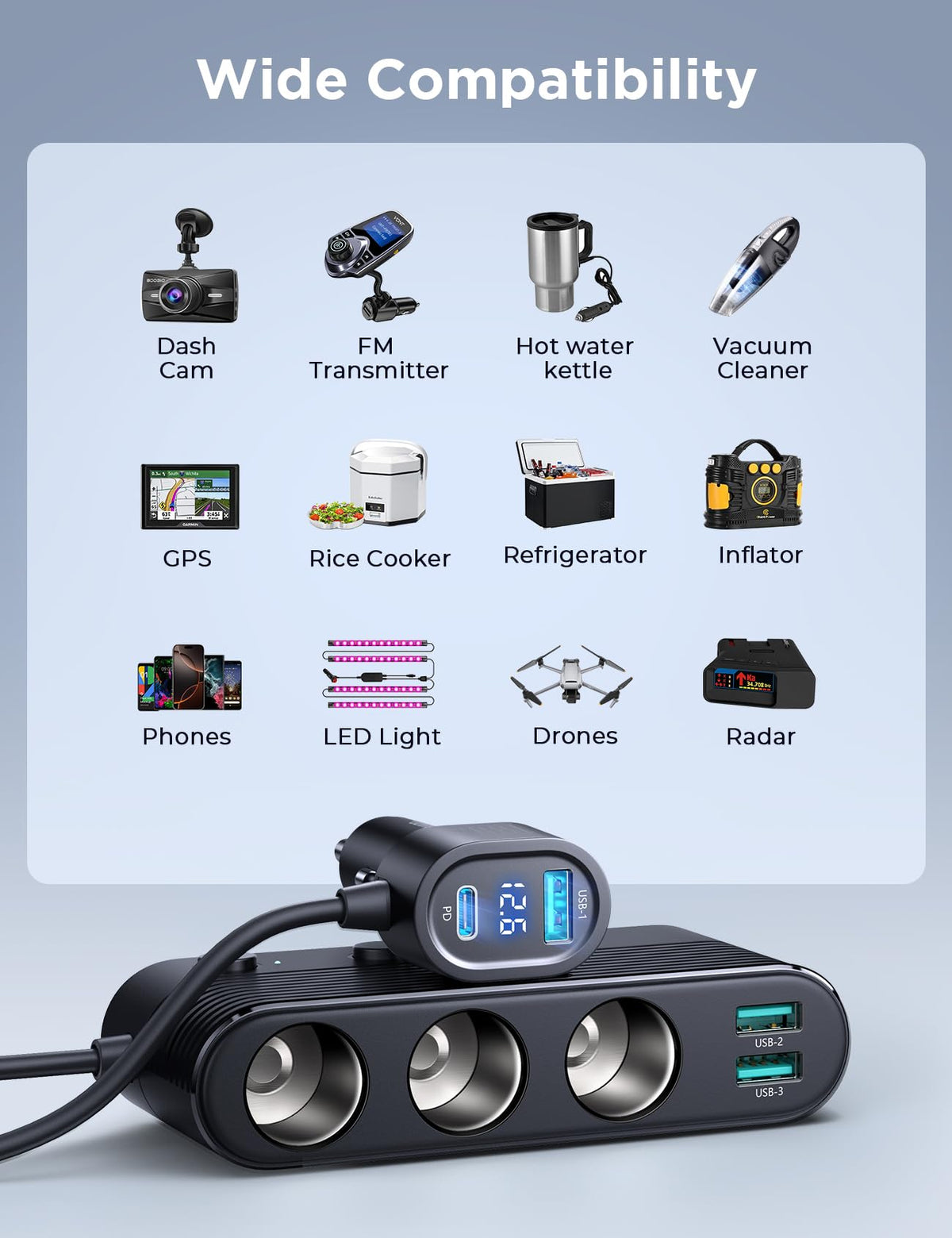 Q: What devices can I charge with the JOYROOM 7 in 1 Cigarette Lighter Adapter?A: The JOYROOM 7 in 1 Cigarette Lighter Adapter can charge multiple devices simultaneously, including GPS units, Dash Cams, vacuum cleaners, car fridges, heated seats, and more due to its 139W total output capability.