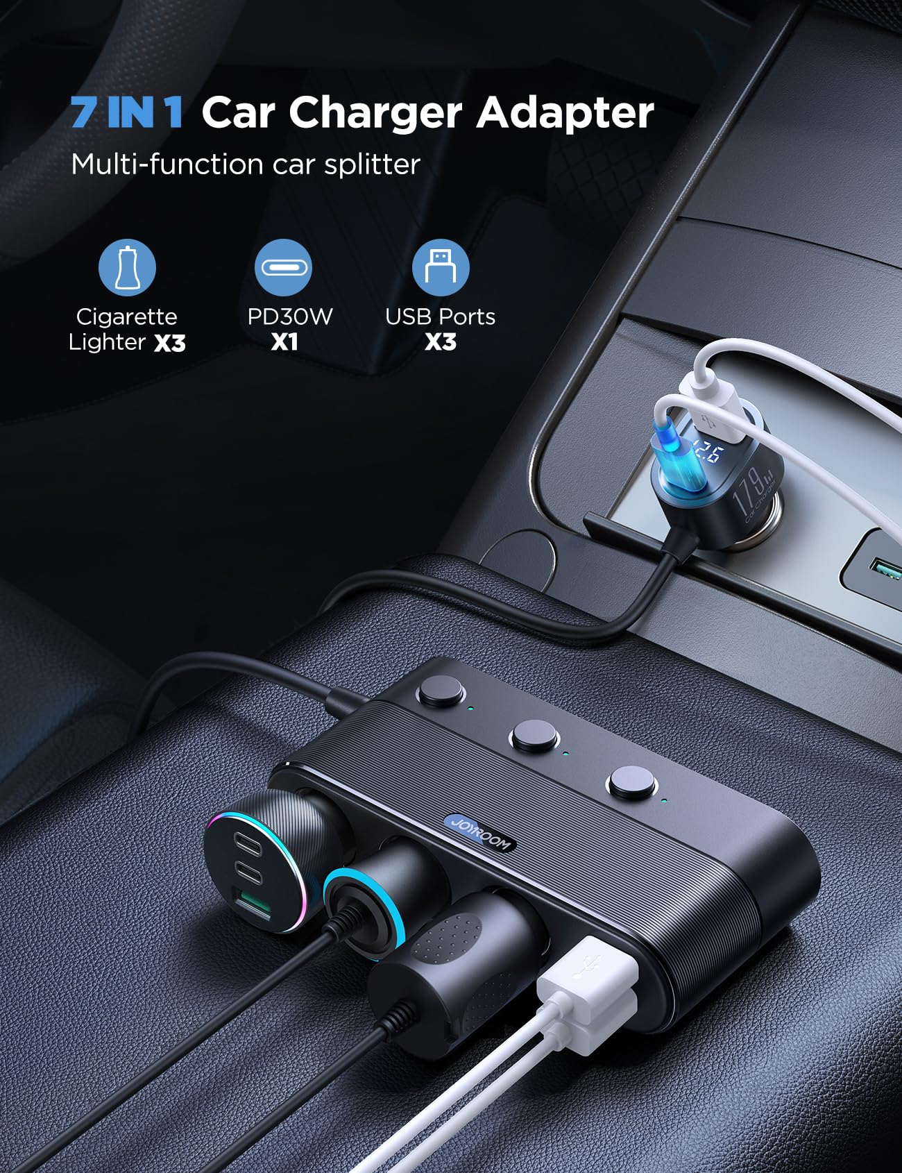 [2025 Upgraded] 7 In 1 Cigarette Lighter Adapter, Joyroom 179W Car Charger Adapter With Pd30W Charge(3.3Ft Cable), 24V/ 12V Cigarette Lighter Splitter With Independent Switches & Led Voltage Display