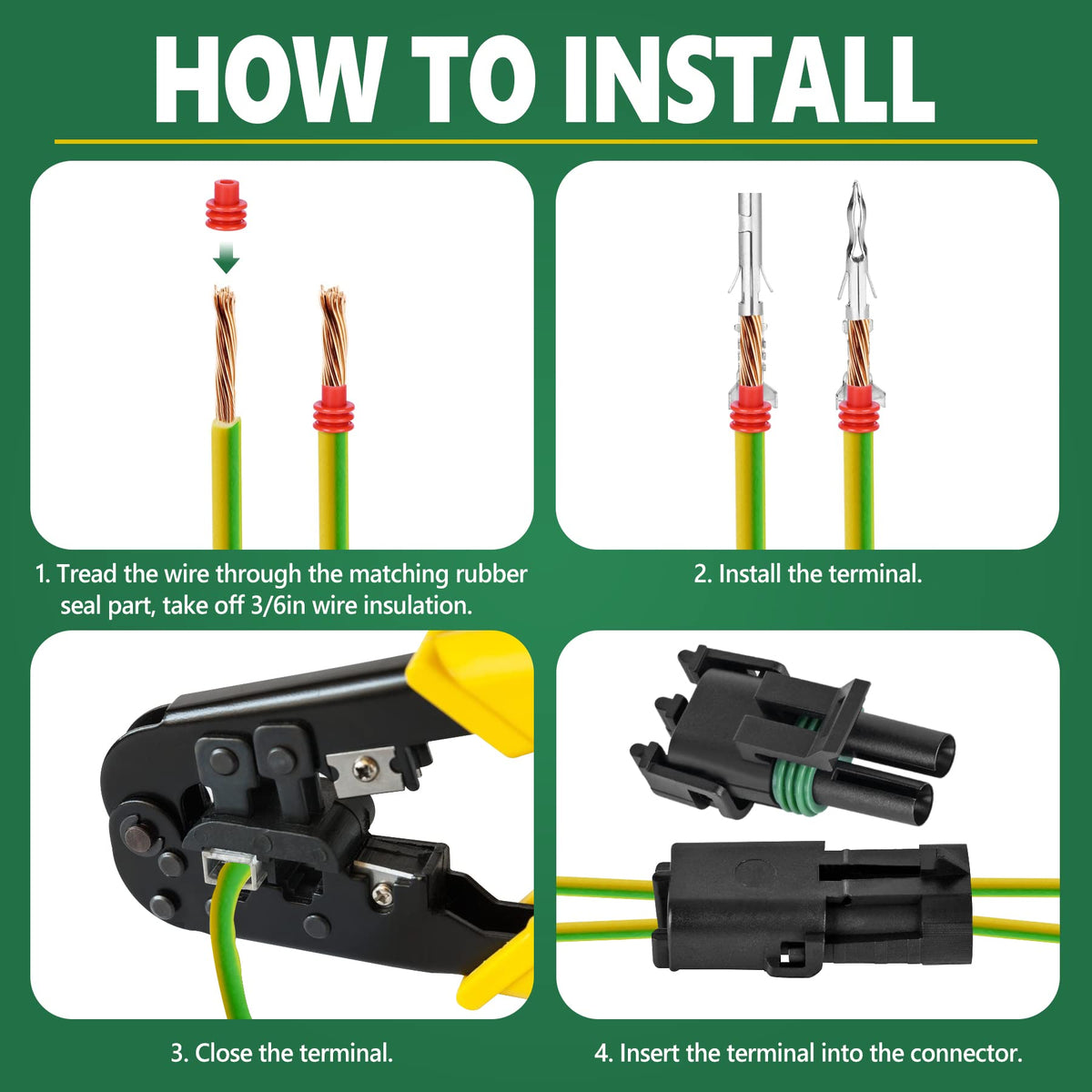 Q: How do I install the connectors from this kit?A: Installation is straightforward: simply solder or crimp the connectors onto your wires. You'll hear a 'click' sound when the installation is done correctly, ensuring a secure fit.