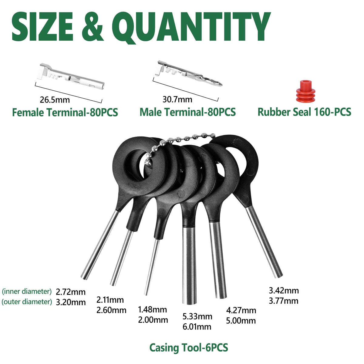 Q: What sizes of pins are included in this connector kit?A: The kit includes a variety of pin sizes: 7pcs of 1 Pin, 8pcs of 2 Pin, 5pcs of 3 Pin, 3pcs of 4 Pin, and 2pcs of 6 Pin connectors, along with male and female terminals.