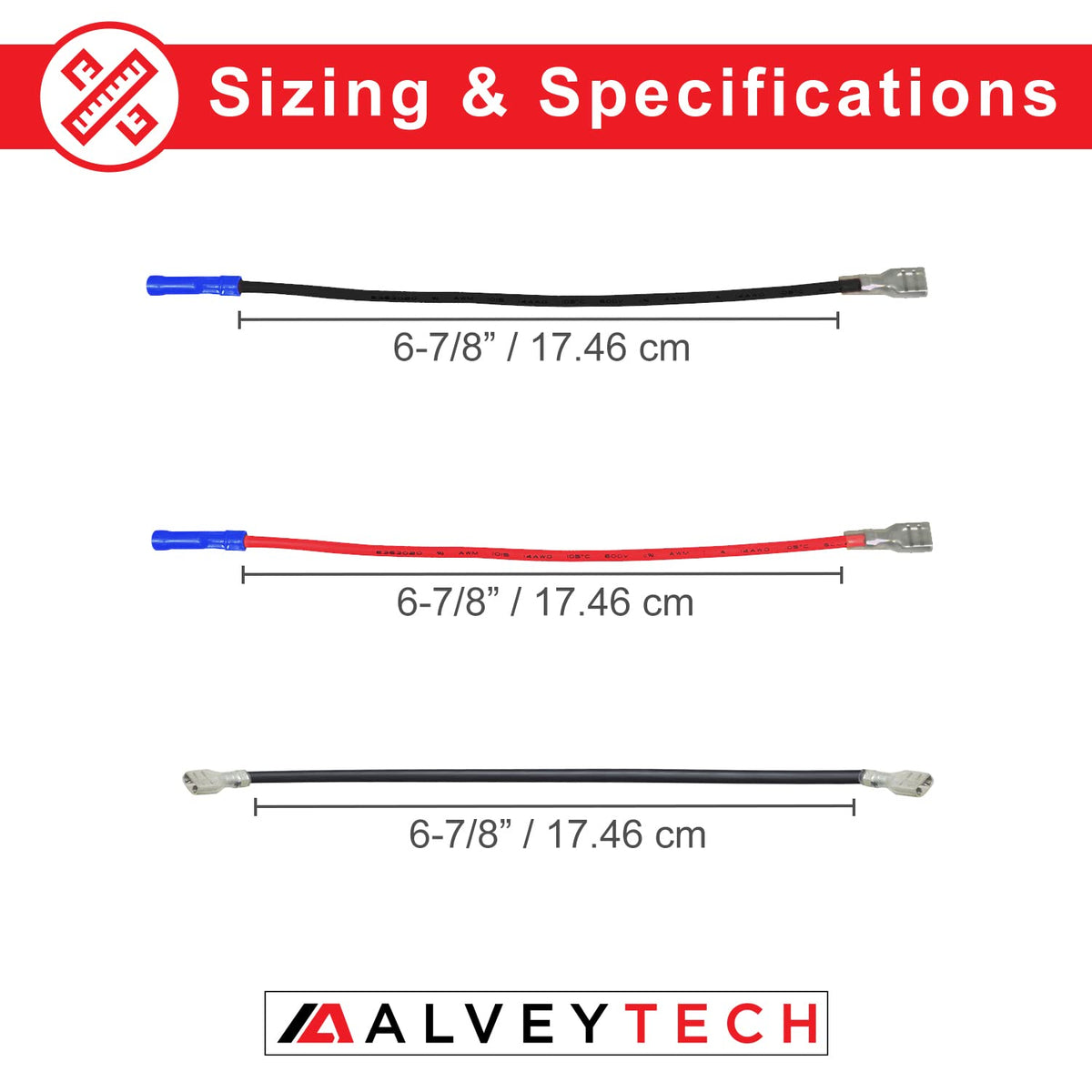 Q: What is the length of each wire in the wiring harness kit?A: Each wire in the AlveyTech 24 Volt Universal Battery Wiring Harness Kit measures 6-7/8 inches (17.46 cm) long, allowing for flexible installation options.