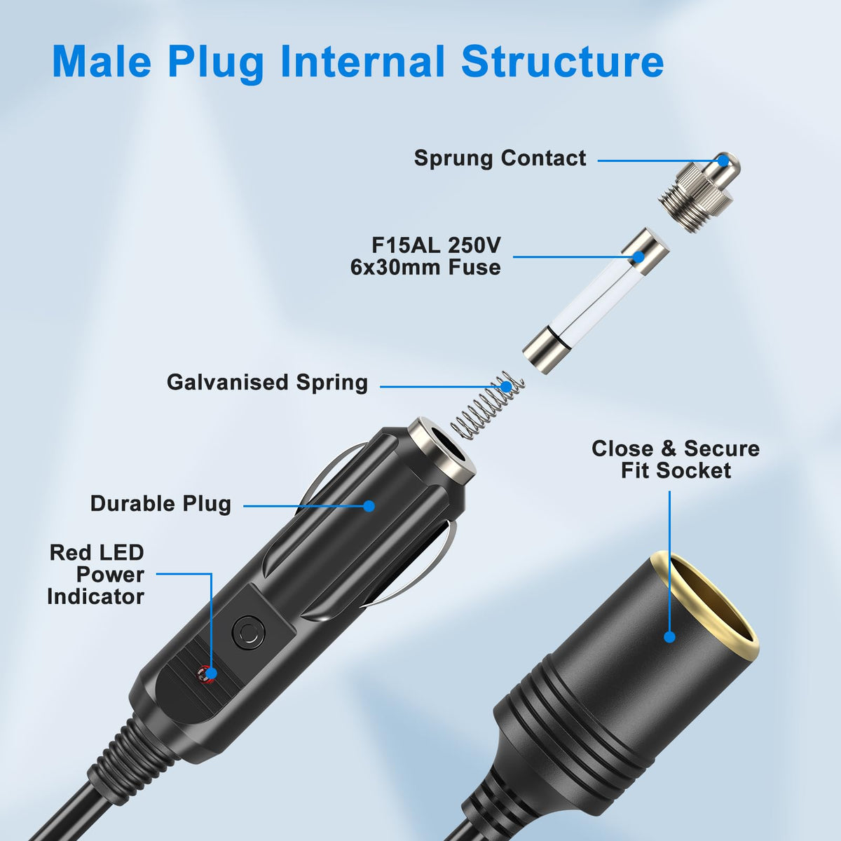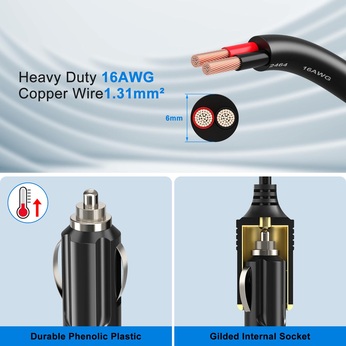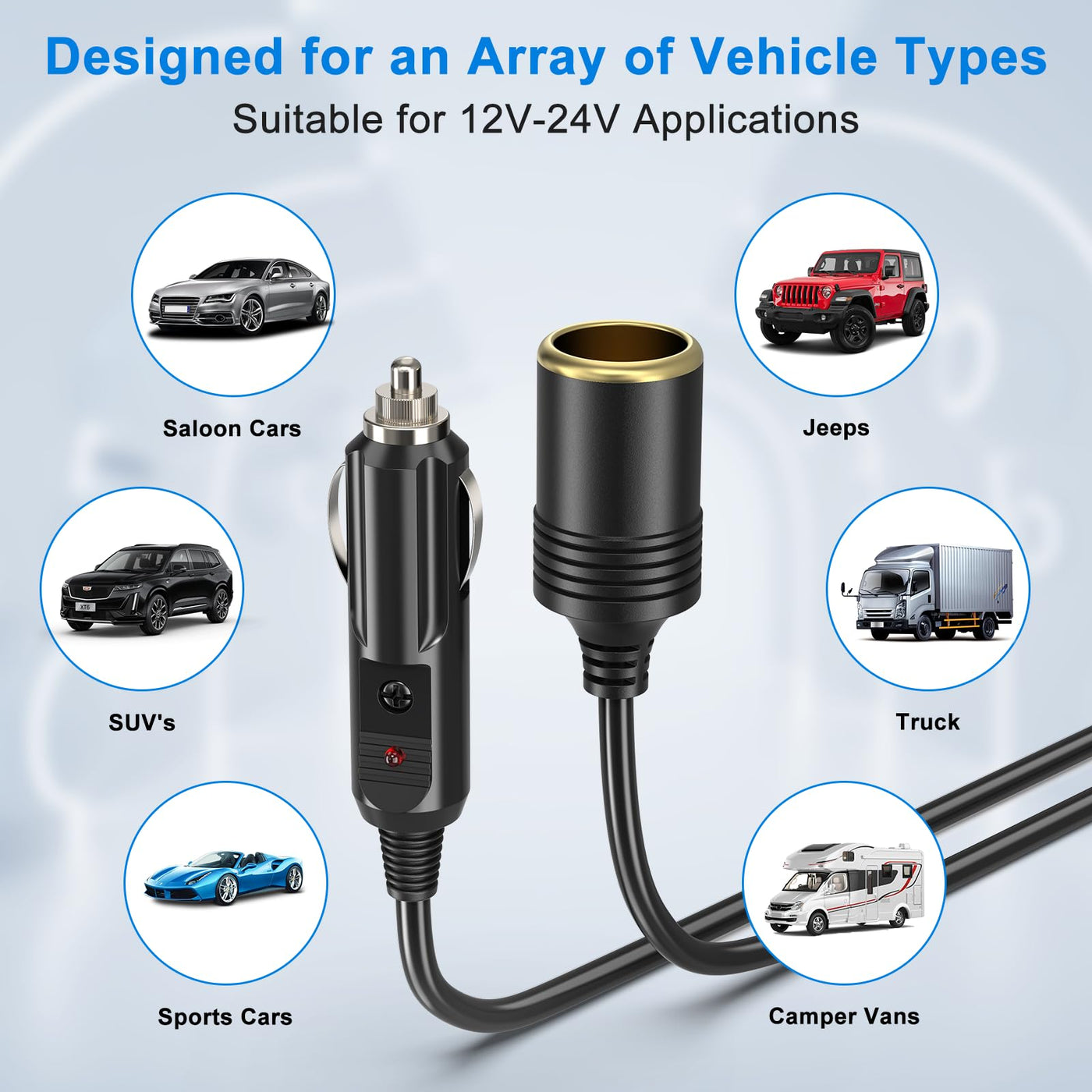 Amacam 12V/24V Car Charger Extension-Heavy Duty 19.68Ft Cable With Inline Cigarette Lighter Socket. Suitable For Tire Inflators