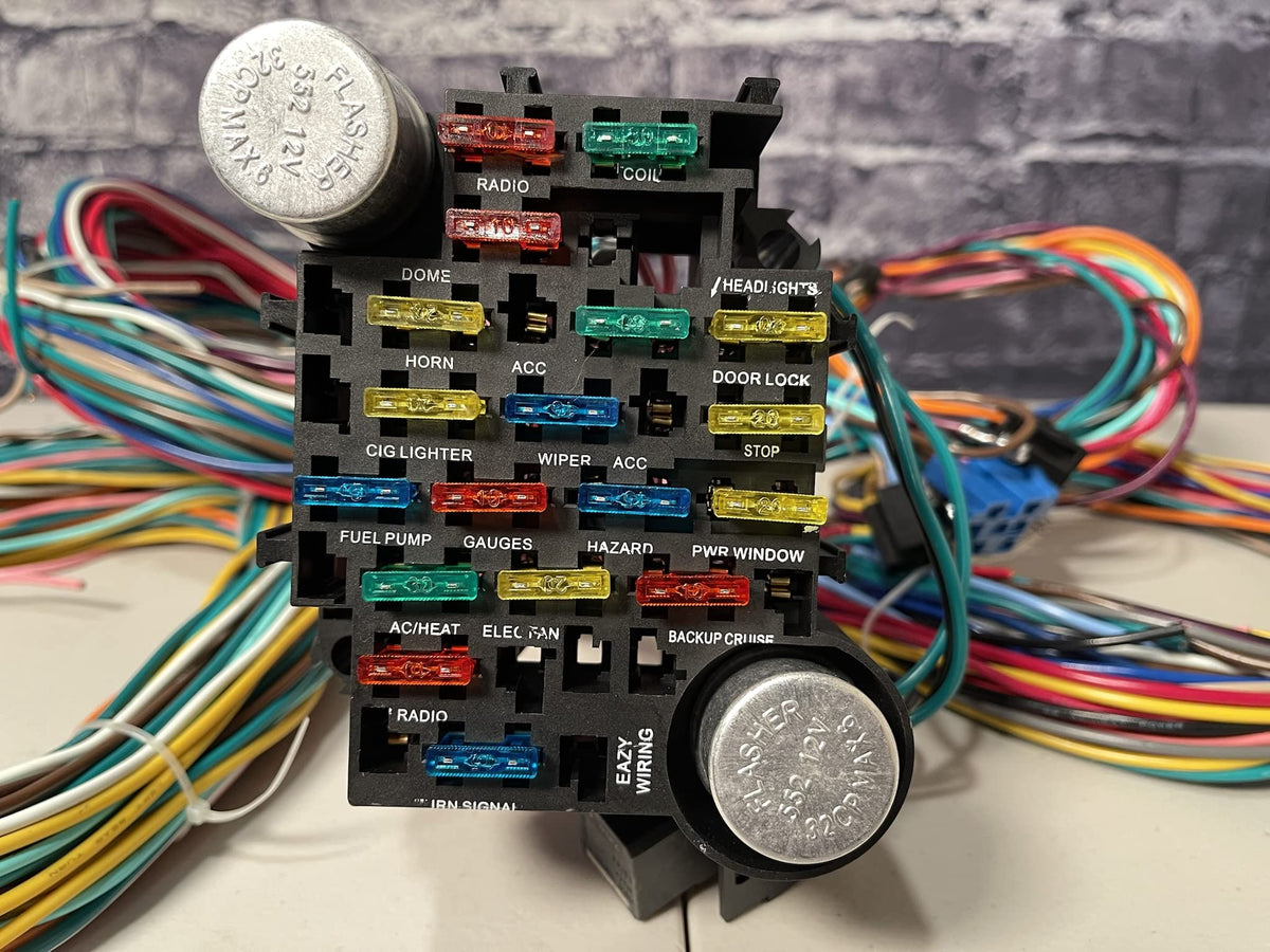 This item is a 21 Circuit Wiring HarnessThe circuits included: horn, fan, dome light, hazard, radio, cigarette lighter, door locks, brake, headlights, trunk light, gauges, back up and cruise, wipers, choke, coil, a/c, electric fuel pump, power windows and turn signals .The 12 circuits Wiring Harness also includes horn relay and connector, turn and hazard signals, dimmer switch connector,circuit breaker for headlights, 2 flashers, 1 alternator plug, 2 ignition switch connectors.Feature:17 fuses and 21 circuitsLong wires to fit on almost all vehiclesAll wires are labeled every 5 inchesWires are codedGM column connectors includedProfessional installation is highly recommendedFor Chevy ,Mopar Ford Hotrods universalThis harness kit includes full instructions, still professional installation is highly recommended.?