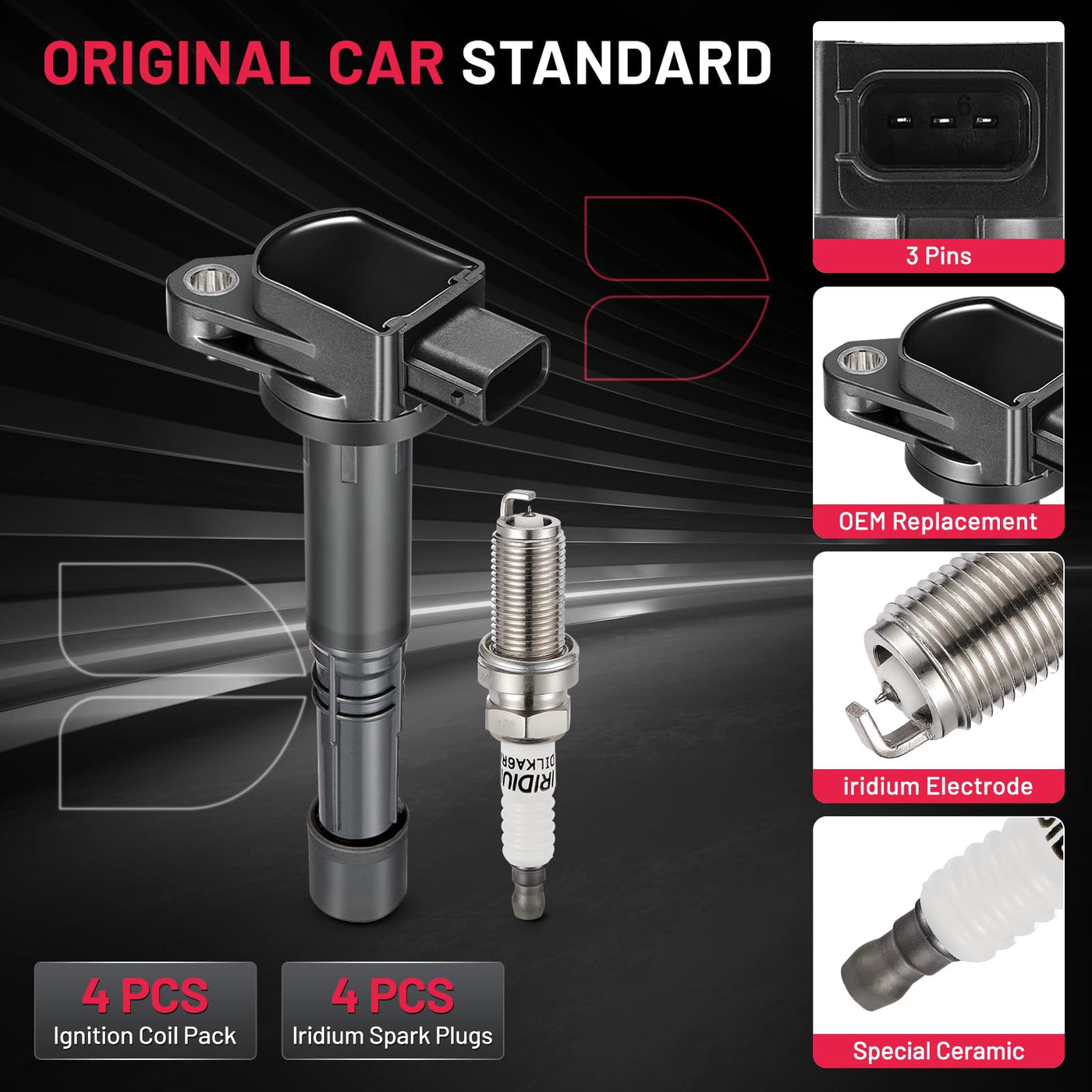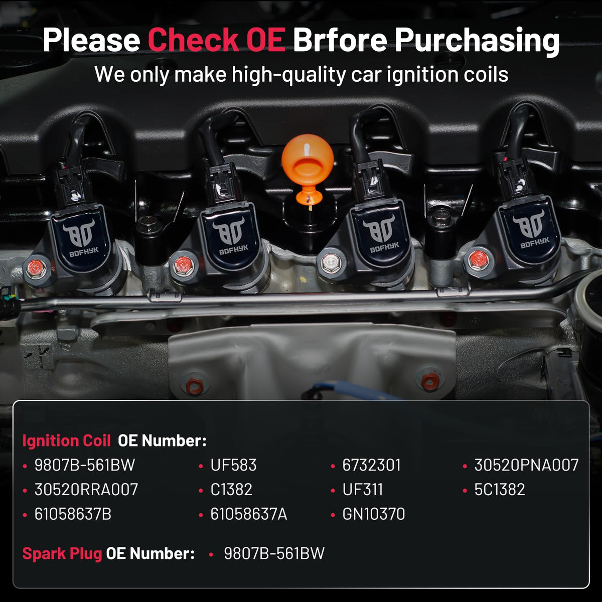 Q: What vehicles are compatible with the BDFHYK Ignition Coil Pack and Iridium Spark Plugs?A: The BDFHYK Ignition Coil Pack and Iridium Spark Plugs are designed to fit Acura RSX, Honda Accord, Civic, CR-V, and Element models. Always verify the OE numbers such as UF583 and 9807B-561BW for precise compatibility.