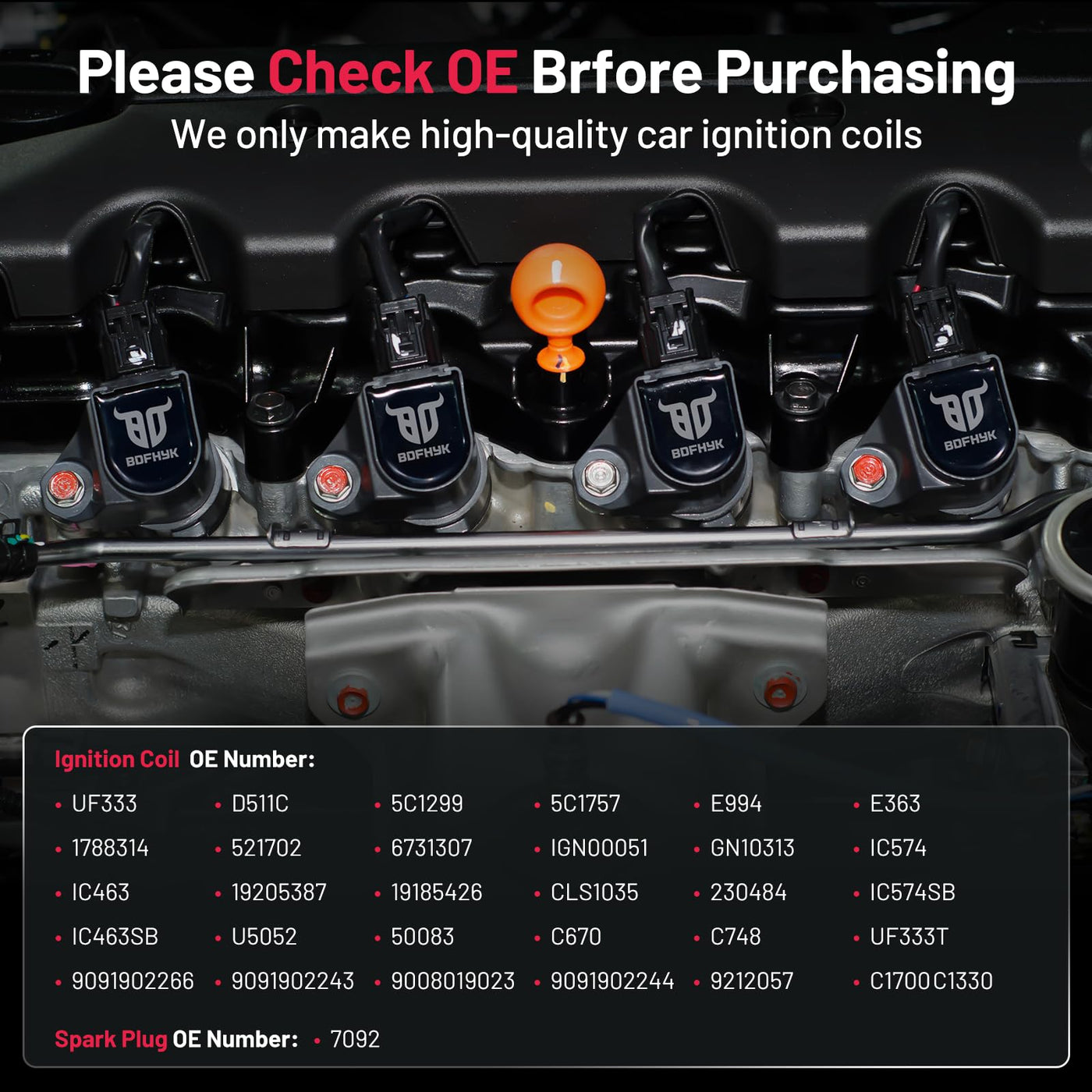 Q: What are the OE numbers for the BDFHYK ignition coil and spark plug?A: For the ignition coil, the OE numbers include UF333, D511C, 5C1299, and more. The OE number for the spark plug is 7092. It is crucial to check these numbers to ensure compatibility with your vehicle.