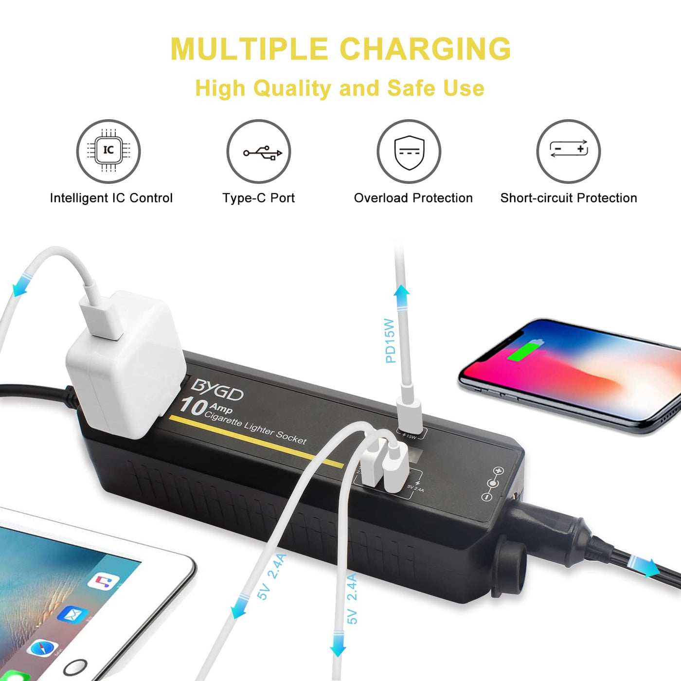 Q: How does the Type-C output work on this converter?A: The Type-C output on the BYGD converter provides 15W of power, allowing you to charge compatible devices quickly and efficiently, in addition to the two USB ports that offer 5V/2.4A each.