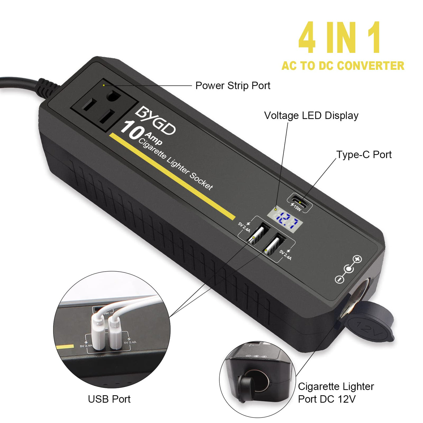 Bygd 4 In 1 Ac To Dc Converter, 120W Adapter 12V 10A Car Cigarette Converter Lighter Socket Cigarette Lighter Socket Power Adapt