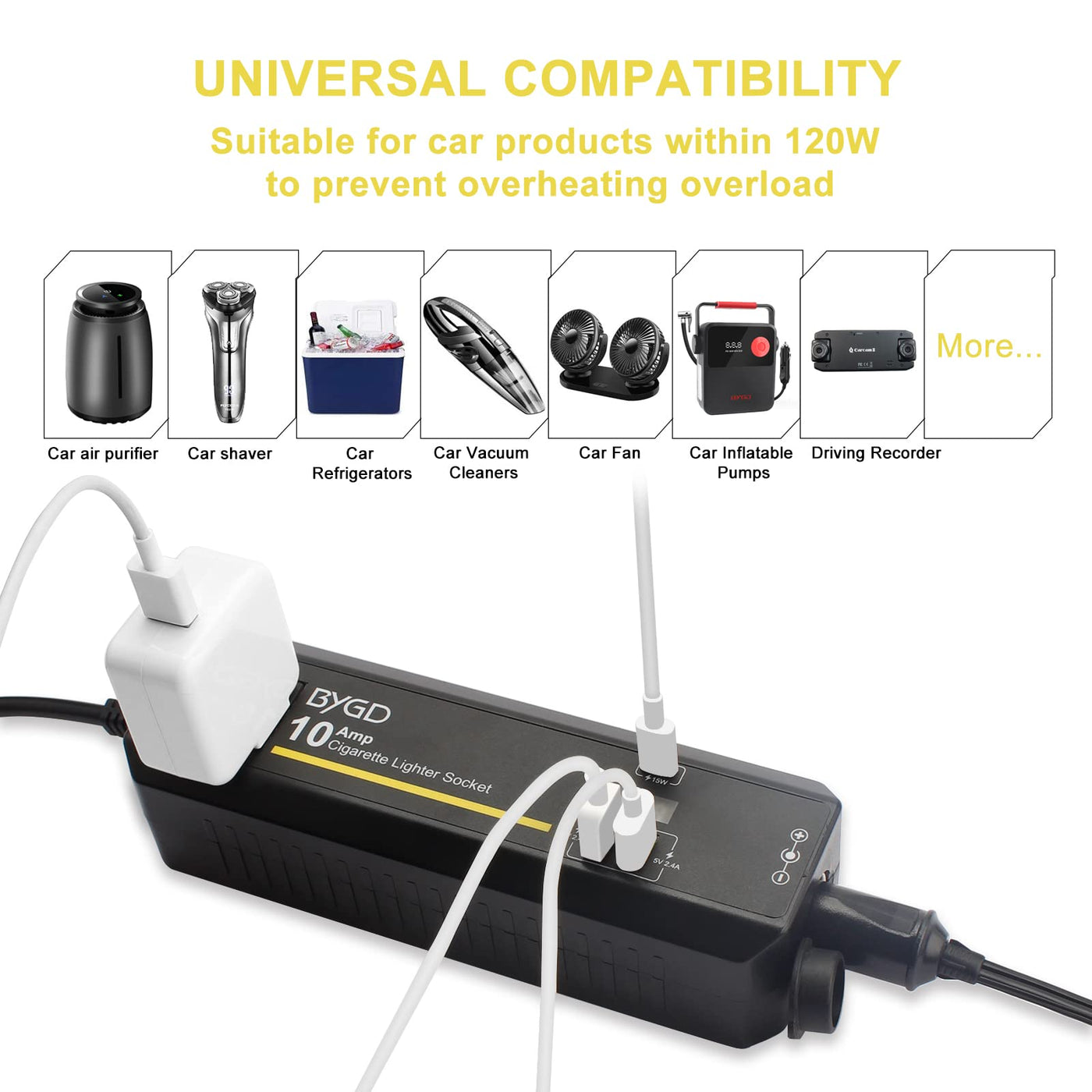 Q: What devices can I power with the BYGD 4 in 1 AC to DC Converter?A: The BYGD 4 in 1 AC to DC Converter can power any car-powered devices under 120W, such as tire inflators, vacuum cleaners, car massage cushions, and car air fans.
