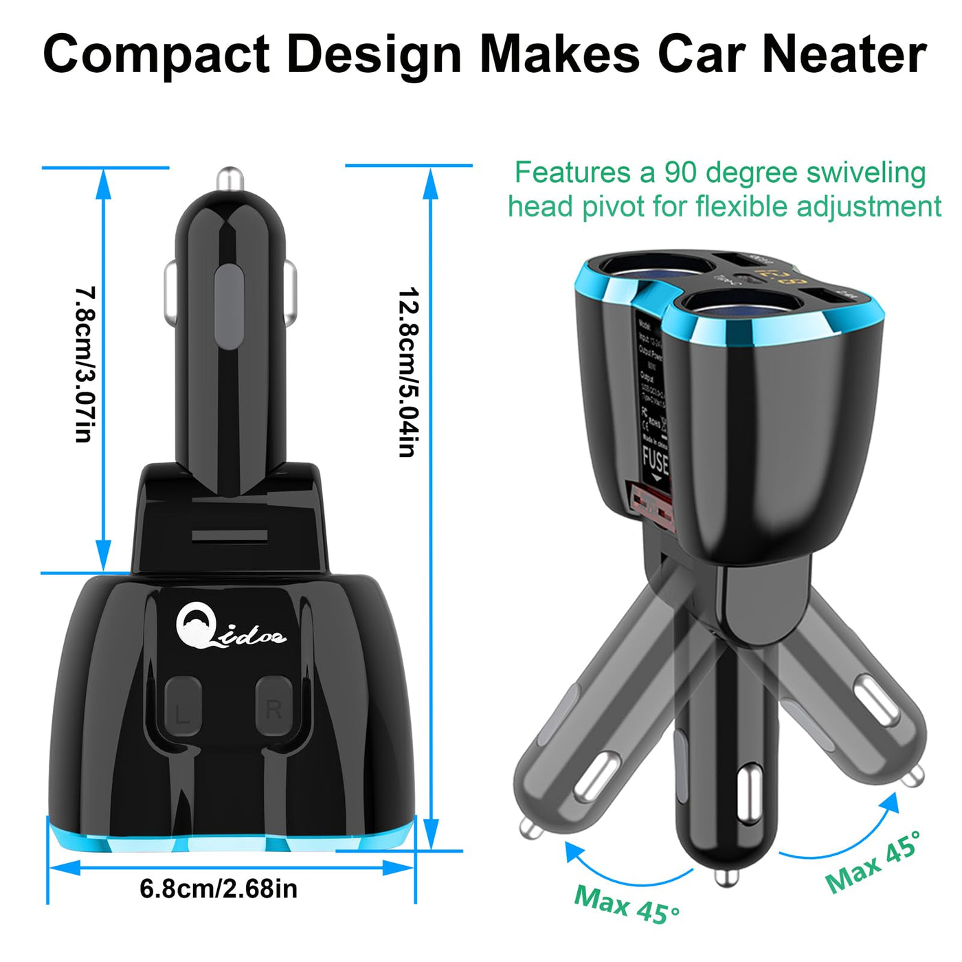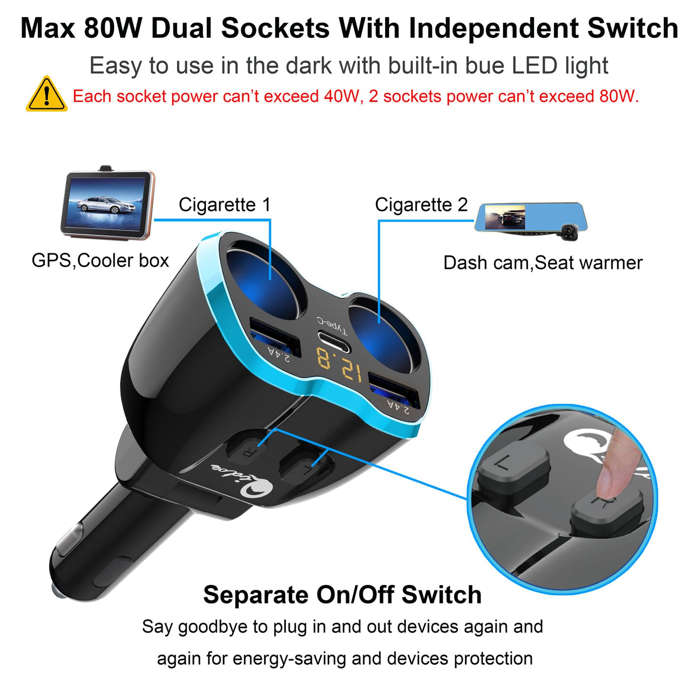 80W Cigarette Lighter Usb C Car Charger, Type C Car Power Adapter Dual Usb For Iphone Ipad, Android Samsung, Gps, Dashcam And More With Car Fuse Meet All Your Charging Needs ? Powerful 2-Port Usb Charger Can Safely Charge Any Usb Powered Devices. Additionally Added A Leading Type C Port. ? 2-Way Socket Outlets Power Your Laptop, Cd Player, Handheld Vacuum Cleaner, Satellite Radio, Radar Detector, Dash Camera And More. ? Smart Ic Technology Intelligently Detects Your Devices To Deliver Its Fastest Possible Charging Speed. ? The Embedded Blue Lights Makes It Easy To Find Two Sockets In The Dark.Upgraded Safety Standards? Adopt High Frequency And Low Resistance Capacitance With Low Ripple, It Will Not Interfere The Navigation, Cell Phone Signal And Other Electronic Devices. ? Built-In Smart Detect Switch, Anti-Corrosion Metal Connectors For Better Overload And Overheat Protection. When Working Power Exceeds 80W Or Input Voltage Is Lower Than 7V, The Cigarette Lighter Splitter Will Automatically Turn Off. ? High-Impact Abs+Pc Plastic Surface With Streamlined Appearance And Dirt-Resistant Finish. Package Contents: 1 X Cigarette Lighter Adapter Socket 2 X 10A Car Fuses 1 * User Guide Specifications: Input Voltage: Dc 12V~24V Socket Output: Dc 12V~24V Usb Output: 5V, 4.8A (Total) Type C Output: 1.5A For Android,1A For Iphone(Max) Rated Socket Power: 80W (Max) Safety Fuse: 10A Net Weight : 120G Friendly Warning: ?Turn Off The Switch Before You Start The Engine. ?Please Make Sure Work On Your 12~24V Vehicle, Do Not Work On Over 24V Or Below 12V Vehicle. ?The Maximum Power Is 80W. So Please Do Not Overload 40W For Each Socket Of Cigarette Lighter Splitter Outlet. Do Not Overload 80W Total 2 Sockets.