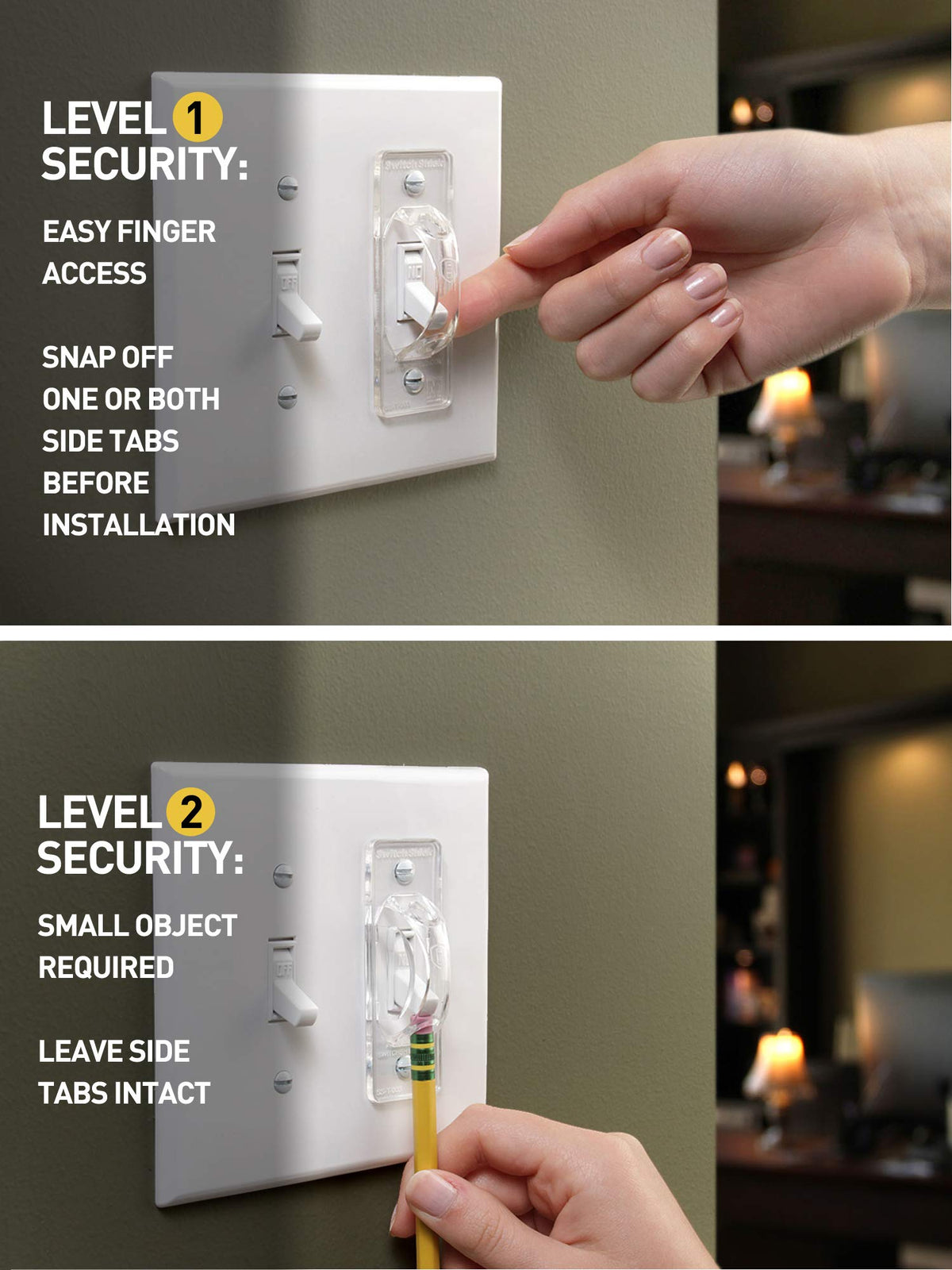 Q: What are the security features of the Clear Light Switch Guards?A: The Clear Light Switch Guards offer two levels of security: Level One Security allows for easy finger access by removing side tabs before installation, while Level Two Security keeps the tabs intact, requiring a small tool for switch activation. This dual security system helps prevent accidental power interruptions.