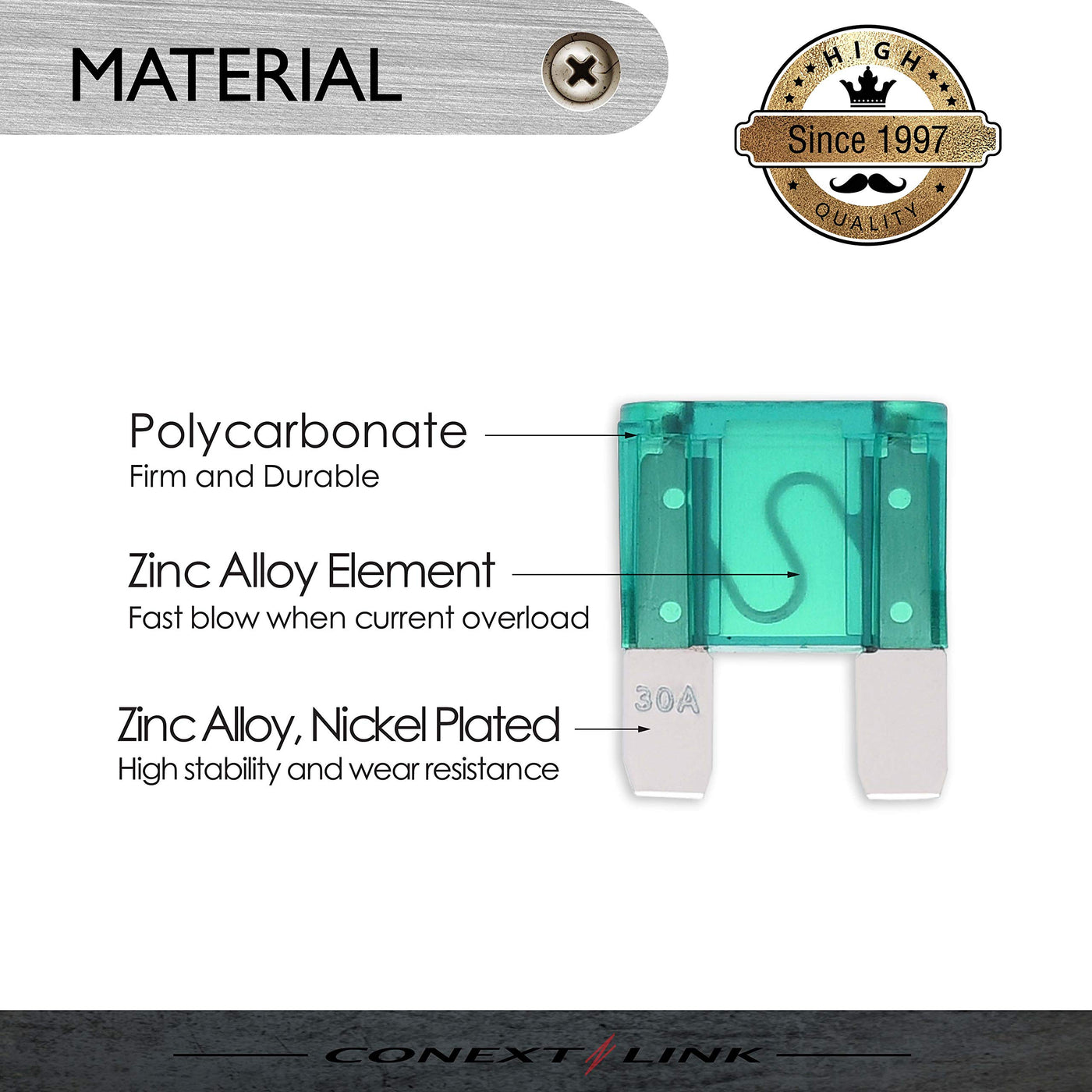 Q: What materials are used in the Conext Link MAXI30-10 fuse?A: The Conext Link MAXI30-10 fuse features a nickel-plated blade, which enhances conductivity and helps prevent corrosion.