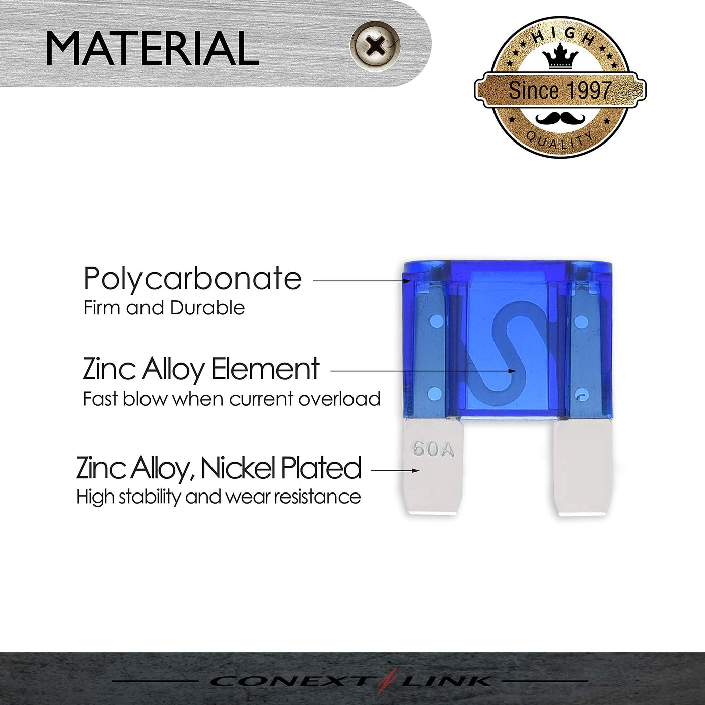 Q: What material is the Conext Link MAXI60-10 Fuse made from?A: The Conext Link MAXI60-10 Fuse features a nickel-plated blade which enhances conductivity and corrosion resistance.