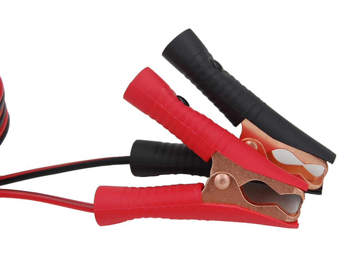 Q: How do I properly connect the battery clamps?A: To connect the battery clamps, attach the red clip to the positive terminal and the black clip to the negative terminal of the car battery. This ensures safe and correct usage for powering appliances.