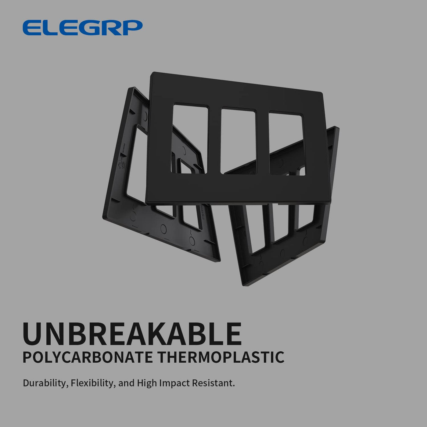Q: What material are the ELEGRP wall plates made from?A: The ELEGRP wall plates are made from unbreakable polycarbonate thermoplastic, offering durability, flexibility, and resilience to withstand impacts and heat.