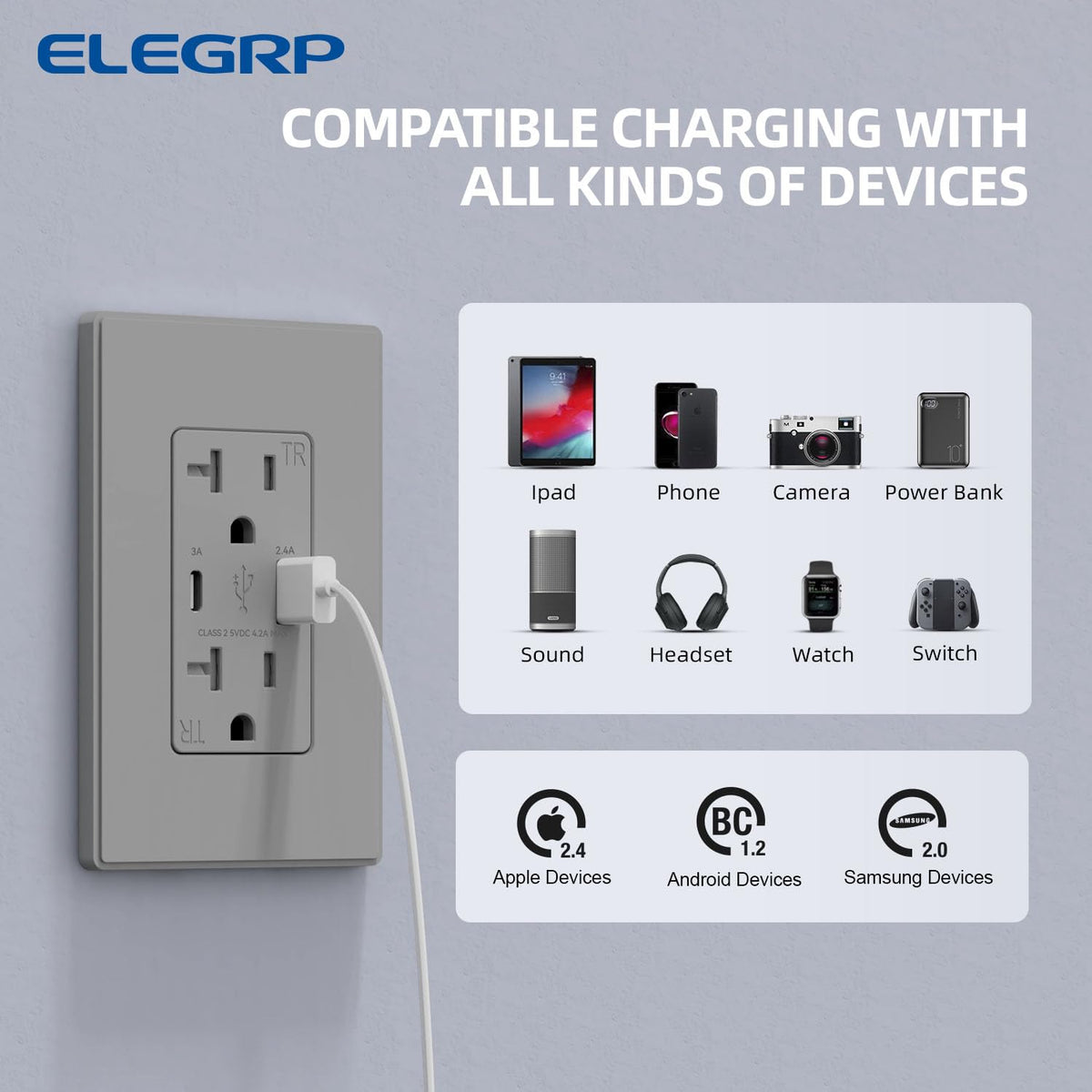 Q: What devices can I charge with the ELEGRP USB Charger Wall Outlet?A: The ELEGRP USB Charger Wall Outlet is compatible with a wide range of devices including iPhones, iPads, iPods, Samsung Galaxy/Note smartphones, Android mobile phones, E-readers, game systems, tablets, headsets, and digital cameras.