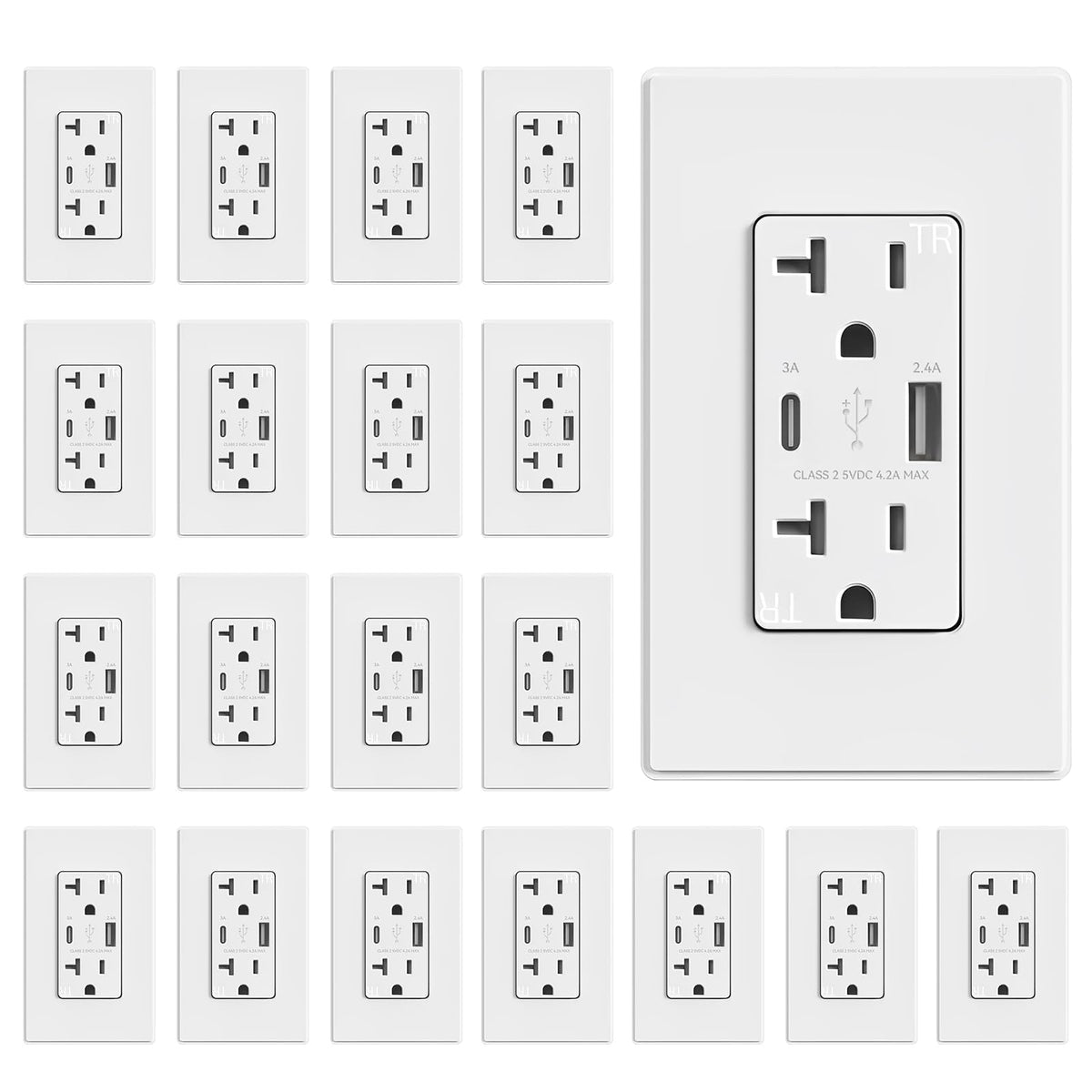 Elegrp Usb Charger Wall Outlet, Usb Receptacle With Usb A & Usb C Ports, 20 Amp Duplex Tamper Resistant Receptacle Plug Nema 5-20R, Wall Plate Included, Ul Listed, 20 Pack, Matte White