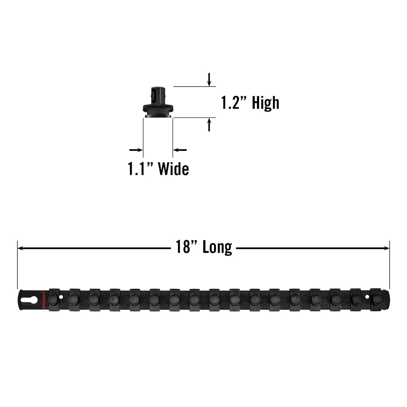 Product DescriptionErnst 18-inch Universal Socket Organizers come with 17 1/2-inch drive Twist Lock socket clips. Twin serrated edges provide 2-sided socket and accessory loading. Additional socket clips and other add-ons snap on both sides for maximum socket storage. It can hang vertically for convenient storage. Dura-Pro Twist Lock clips provide all the versatility you have come to expect from Ernst, now with ''stay put'' security. With a simple twist your sockets are firmly secured in a locked position. Twist in the reverse direction and your sockets are free to remove. The tension is a perfect medium so you do not have to fight with your sockets to lock them into place and you don't have to worry about them being too loose. Just a simple 1/8 turn and your tools are secured. Add, remove, and insert clips on any portion of the socket rail to fit your custom set of tools. Socket clips click into place, can be easily repositioned and installed between previously placed clips. End stops on each end of the socket organizer keep socket clips securely fastened. No other socket storage item on the market will provide this amount of options. Integrated design will work with other great products from Ernst. 96 I.D. stickers are included with each organizer for easy tool identification. Made in the USA. Lifetime guarantee. Tools not included.From the ManufacturerErnst 18-inch Universal Socket Organizers come with 17 1/2-inch drive Twist Lock socket clips. Twin serrated edges provide 2-sided socket and accessory loading. Additional socket clips and other add-ons snap on both sides for maximum socket storage. It can hang vertically for convenient storage. Dura-Pro Twist Lock clips provide all the versatility you have come to expect from Ernst, now with ''stay put'' security. With a simple twist your sockets are firmly secured in a locked position. Twist in the reverse direction and your sockets are free to remove. The tension is a perfect medium so you do not have to fight with your sockets to lock them into place and you don't have to worry about them being too loose. Just a simple 1/8 turn and your tools are secured. Add, remove, and insert clips on any portion of the socket rail to fit your custom set of tools. Socket clips click into place, can be easily repositioned and installed between previously placed clips. End stops on each end of the socket organizer keep socket clips securely fastened. No other socket storage item on the market will provide this amount of options. Integrated design will work with other great products from Ernst. 96 I.D. stickers are included with each organizer for easy tool identification. Made in the USA. Lifetime guarantee. Tools not included.