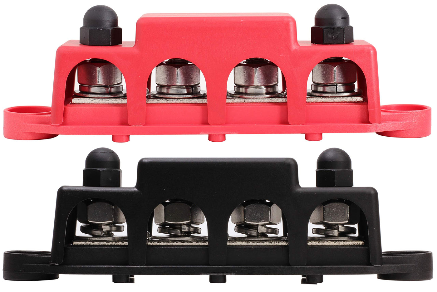 The Fastronix 4 Stud Power and Ground Distribution Blocks are the best way to consolidate your high current power cables in one protected location. These blocks feature 4 heavy duty 3/8'' stainless steel studs integrated with a nickel plated brass bus-bar to provide a single location for your heavy duty power cables. Included with the block are 3 smaller 20 Amp screw terminals for additional wires. Also included is a heavy duty cover secured by two coated screw caps to ensure your connections are protected from inadvertent shorting. This block is rated to 48V or 250 Amps at 12VDC. Maximum torque for 3/8'' studs is 15 ft-lbs. Install nuts using ANTI-SEIZE thread lubricant.