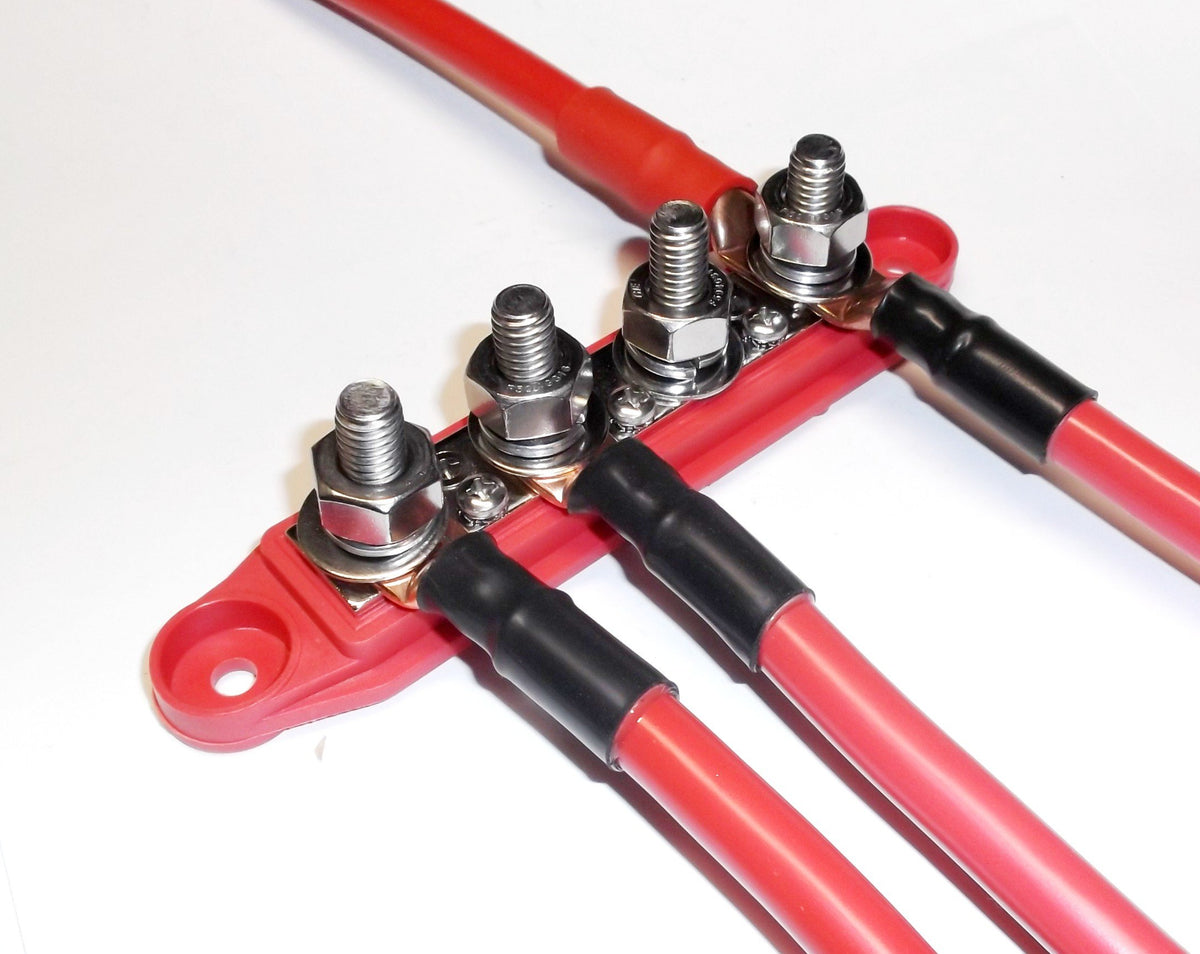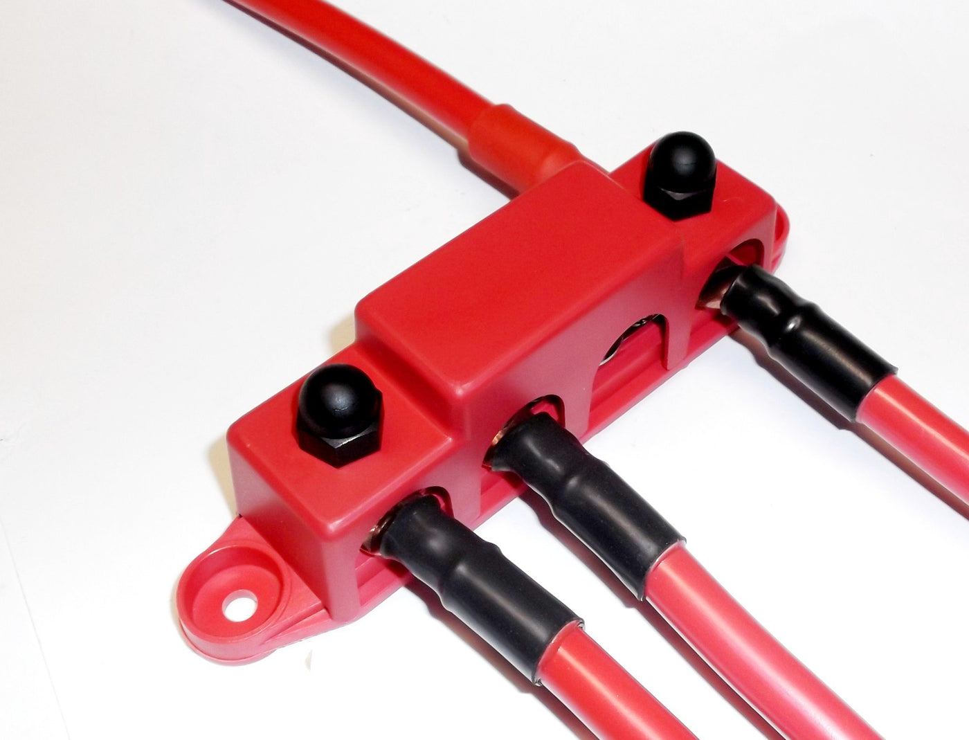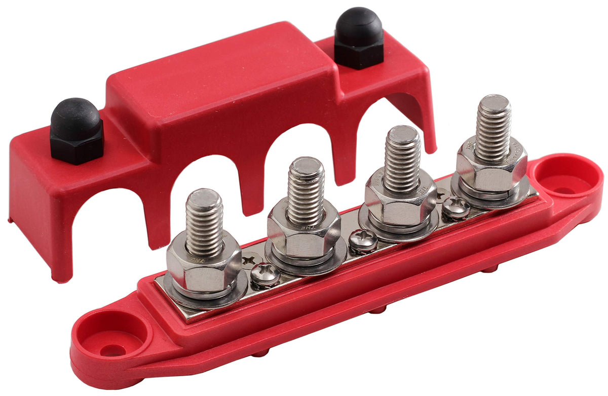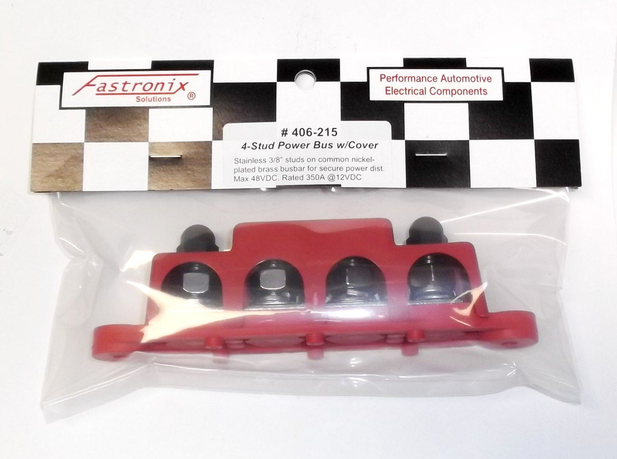 The Fastronix 4 Stud Power Distribution Block is the best way to consolidate your high current power cables in one protected location. This block features 4 heavy duty 3/8'' stainless steel studs integrated with a nickel plated brass bus-bar to provide a single location for your heavy duty power cables. Included with the block are 3 smaller 20 Amp screw terminals for additional wires. Also included is a heavy duty cover secured by two coated screw caps to ensure your connections are protected from inadvertent shorting. This block is rated to 48V or 250 Amps at 12VDC. Maximum torque for 3/8'' studs is 15 ft-lbs. Install nuts using ANTI-SEIZE thread lubricant.