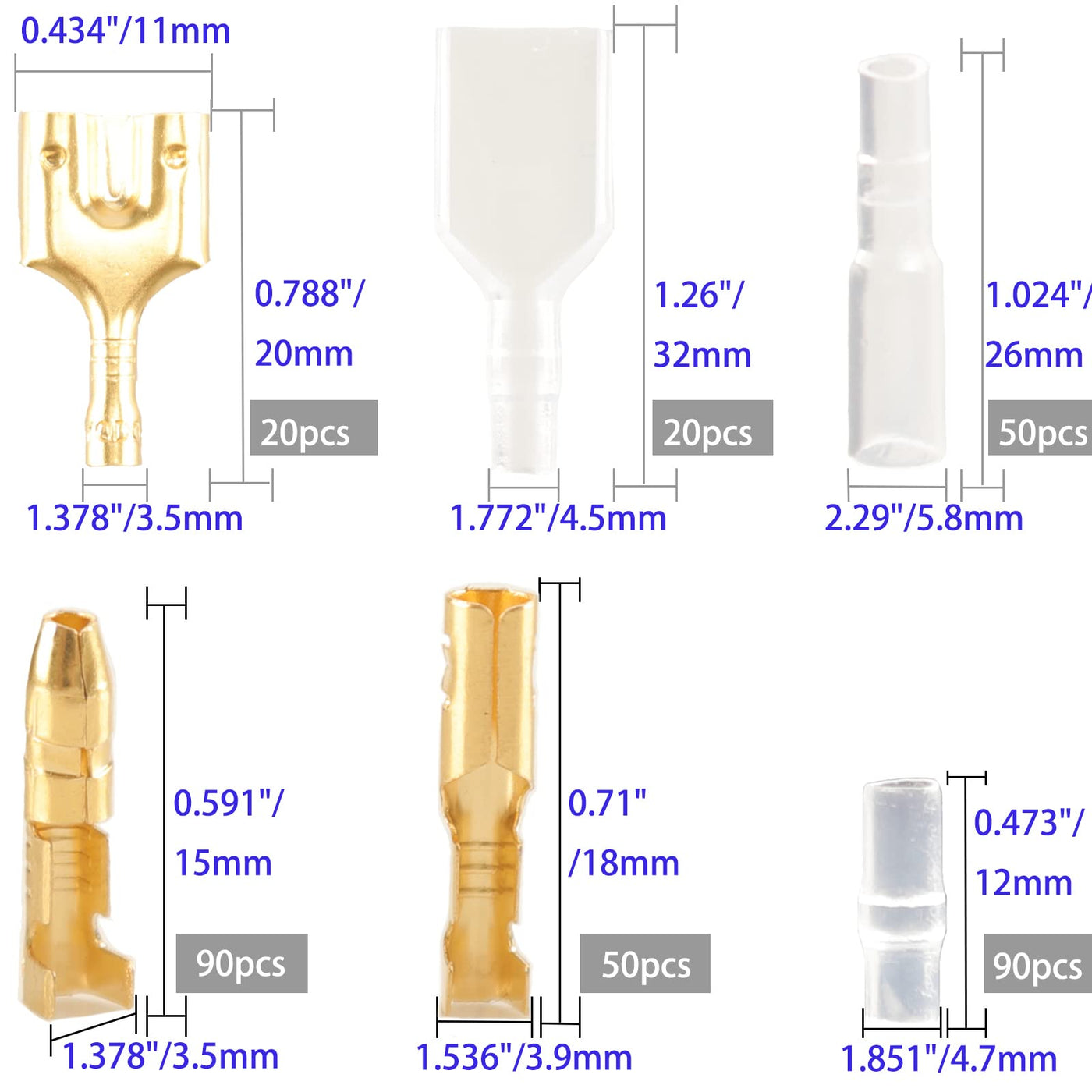 The Feggizuli 320pcs Double Bullet Wire Connectors kit is designed for quick and efficient electrical connections. The connectors are made of thick tinned copper material, ensuring long-lasting performance and good conductivity. This kit includes 90pcs male bullet connectors, 50pcs female bullet connectors, 20pcs dual female bullet connectors, 90pcs male insulating sleeves, 50pcs female insulating sleeves, and 20pcs dual female insulating sleeves. The insulating sleeves are made of flame-retardant PVC for added safety. The connectors are compliant with all electrical standards, making them safe to use. This kit comes in a storage box for easy storage and carrying. The product type is ELECTRONIC COMPONENT TERMINAL, with a model number of US320Round and a unit count of 320 Count.