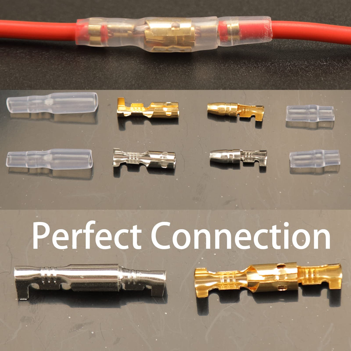 Q: How many connectors does the kit include and what types are there?A: The kit includes a total of 400 pieces: 100 silver bullet terminals, 100 gold bullet terminals, 100 male insulating sleeves, and 100 female insulating sleeves. This variety ensures compatibility with different wiring needs.