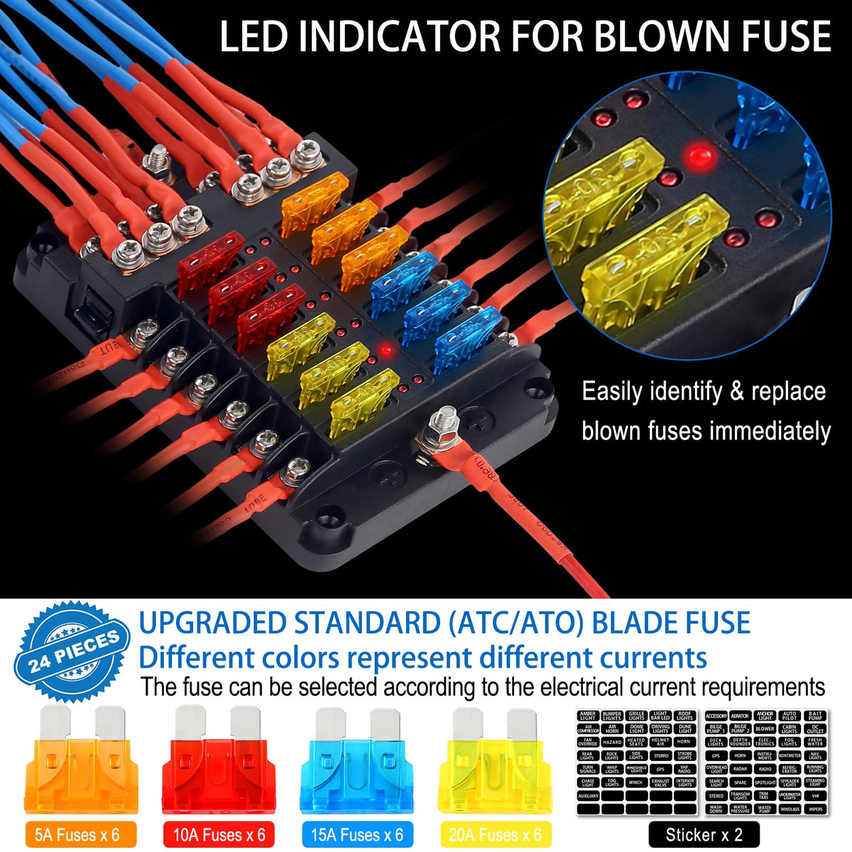 Fuse Block, 12V Fuse Box Holder With Led Indicator Waterproof Cover, Cyrico 12 Circuits Fuse Panel With Negative Bus For 12V/24V Automotive Car Truck Boat Marine Rv Trailer, 24 Pcs Blade Fuses