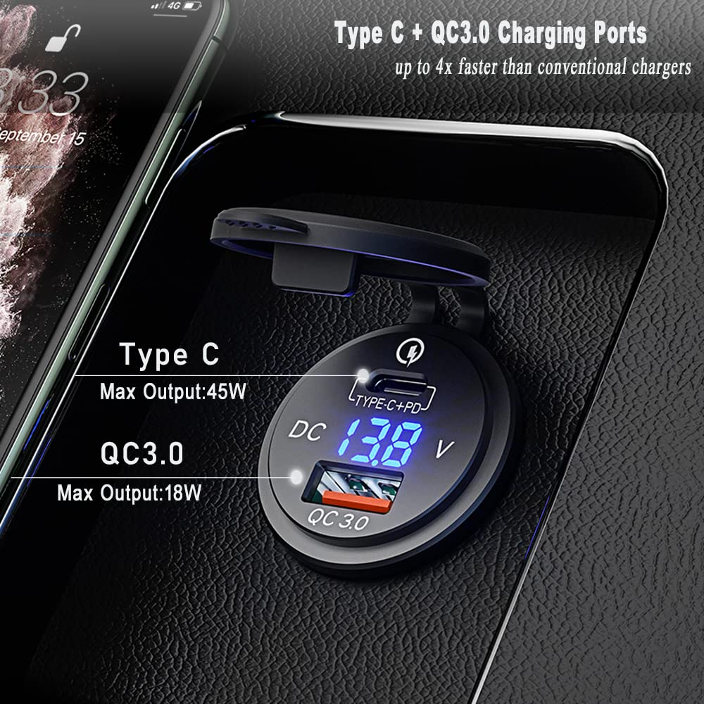 Convenient Led Voltmeter Led Digital Voltmeter Correctly Displays The Working Status Of Your Car'S Battery. Light Indicator Lets You Find Your Ports Easily At Night. Support Pd+Qc3.0 Fast Charging Pd Fast Charging Max Output:46W. Qc3.0 Fast Charge Max Output:18W. Easy Installation Drill A Hole Of 3Cm Diameter In The Space Provided, Then Connect The Built-In Socket To The Battery (Positive Pole With Positive Pole, And Negative Pole With Negative Pole) And Insert The Built-In Socket Into The Hole And Turn It Tight. Specifications: Width: 2.87Cm Height: 4.17Cm Weight: 35G