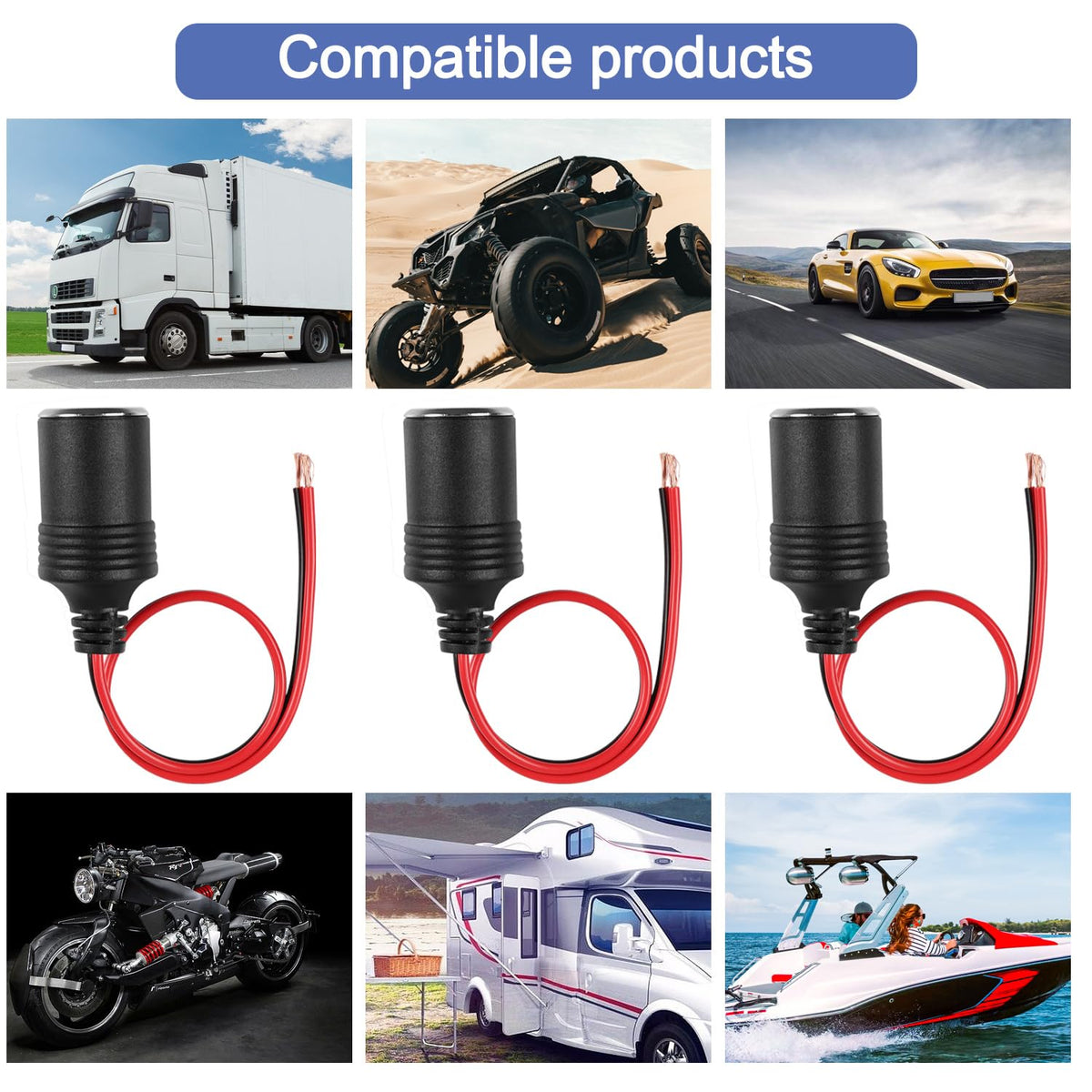 Hatmini 3 Pcs 18Awg Female Car Cigarette Lighter Socket With Bare Wire Open End Cable,1Ft 12/24V Car Charger Power Cigarette Lighter Female Socket Replacement Cable For Equipment Within 120W