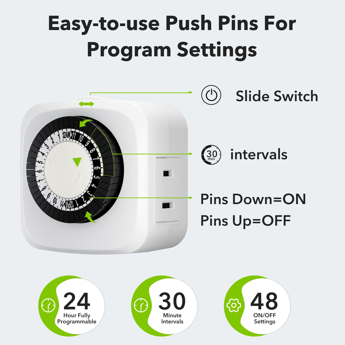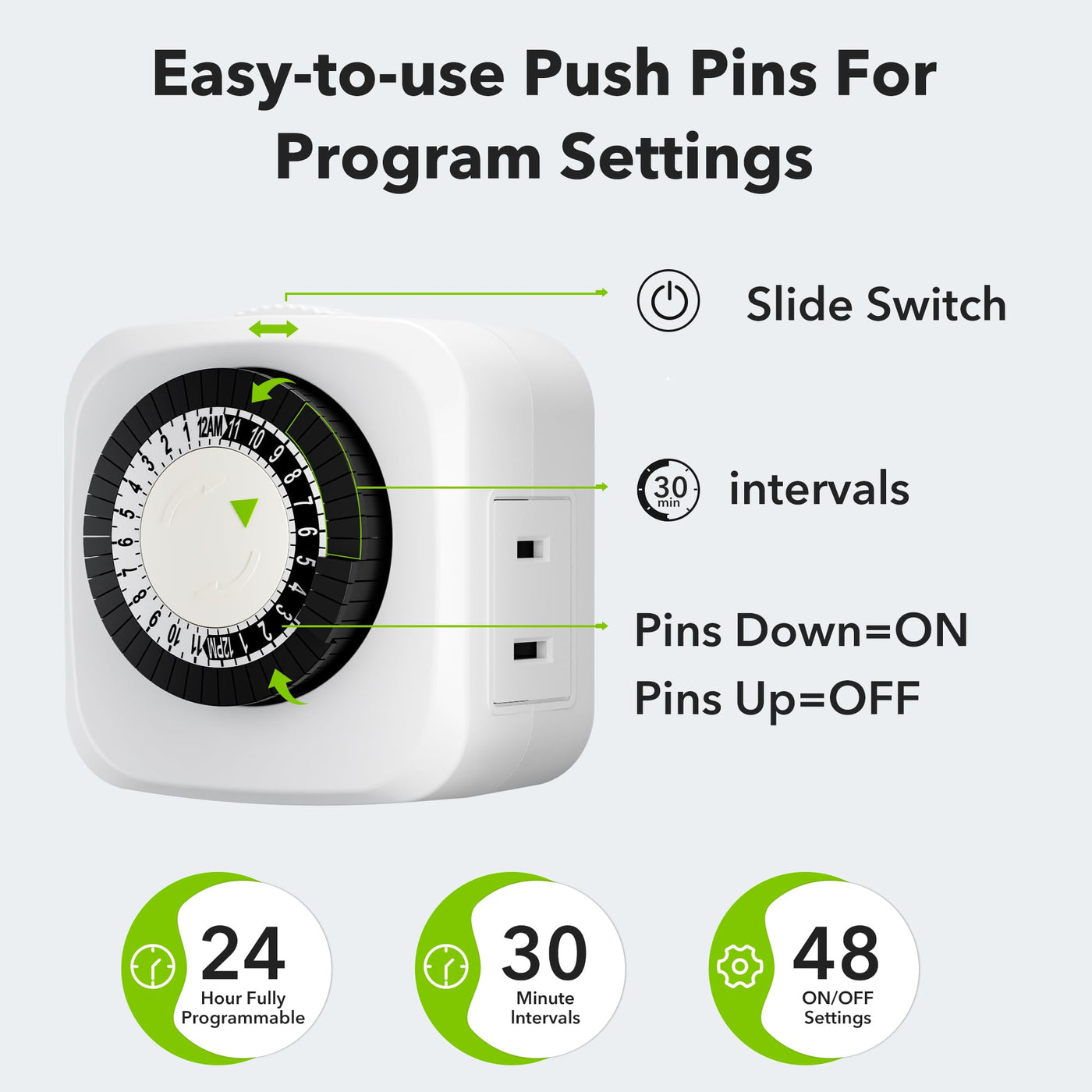 Q: How do I set the timer for my HBN Indoor Timers?A: Setting the HBN Indoor Timer is easy! Simply pull the pins UP to turn the timer OFF and push them DOWN to turn it ON. You can customize your on/off schedule with up to 24 cycles per day at 30-minute intervals.
